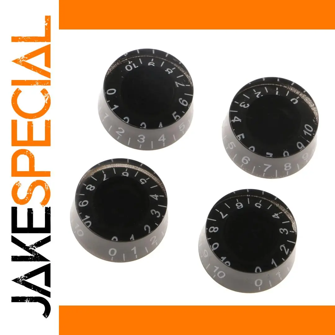 - Set of four black plastic control knobs with transparent domes display a white numeric scale from 0 to 10, improving visibility and control for your electric guitar.