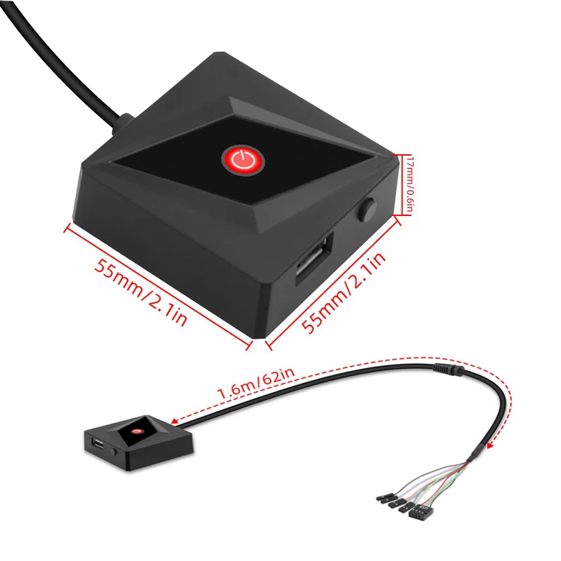 Enhance your workspace with this sleek black desktop peripheral switch featuring a durable ABS shell and PVC cable body. It includes a prominent round power button outlined with a red ring, a smaller restart button, and a USB 2.0 interface port for seamless device connectivity. Designed for versatility, it provides efficient USB port extension, remote control of PC power and reboot functions, and anti-theft security to protect internal components such as CPU, memory, and graphics card. Suitable for internet cafes, offices, homes, schools, and hotels, this compact device measures with a ±3mm accuracy, ensuring reliable performance and streamlined operation for adult professionals.