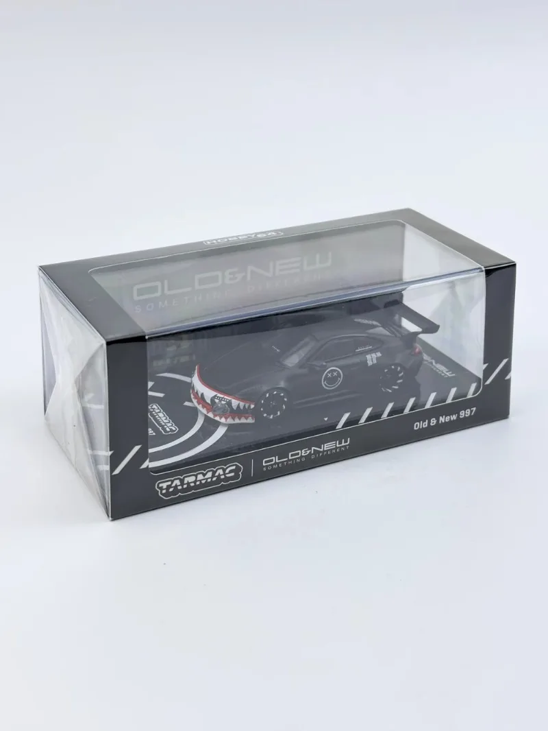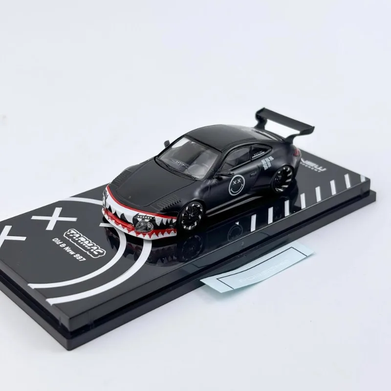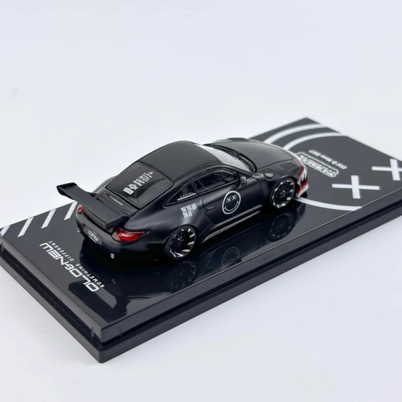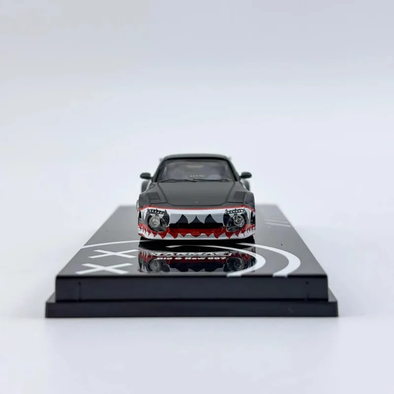 Imagine adding this striking diecast model of a Porsche 911 (997) to your collection, showcasing a sleek black finish with detailed, aerodynamic contours. Crafted from durable metal, plastic, and rubber, this 1:64 scale model captures the iconic silhouette and sporty essence of the original vehicle. Its glossy, matte surface highlights the aggressive graphic accents on the front bumper, resembling a jagged-toothed mouth in white and red. The side features a prominent circular logo with a smiling face and X’s for eyes, giving it an edgy, modern look. The transparent windows reveal a simplified interior, complemented by black multi-spoke wheels with rubber tires. The rear boasts a large, black rear wing spoiler that emphasizes its dynamic performance style. This meticulously crafted model perfectly balances realism and aesthetic appeal, making it an ideal addition for enthusiasts and collectors who appreciate automotive artistry.