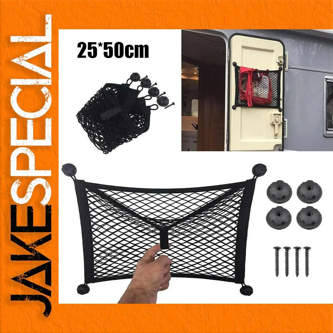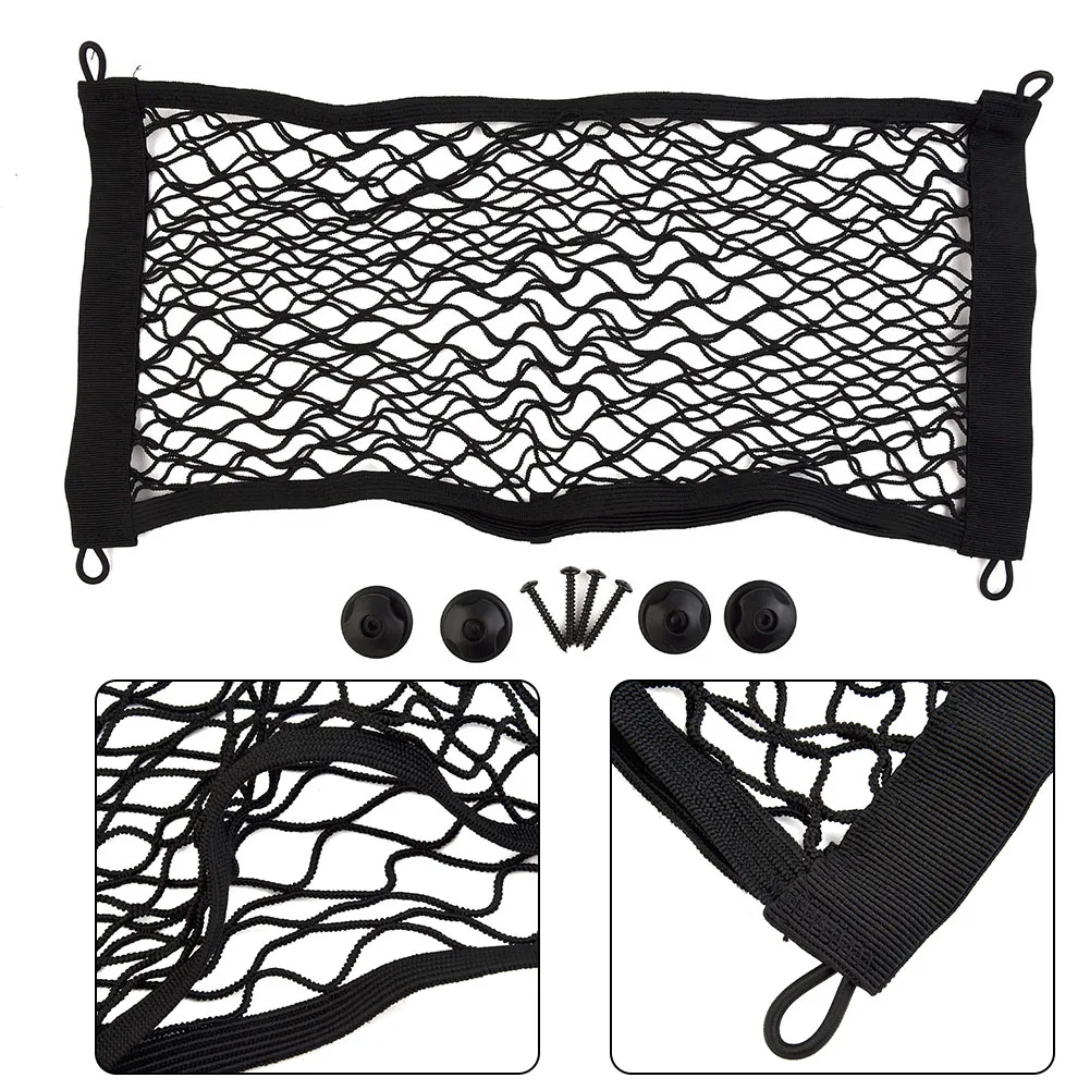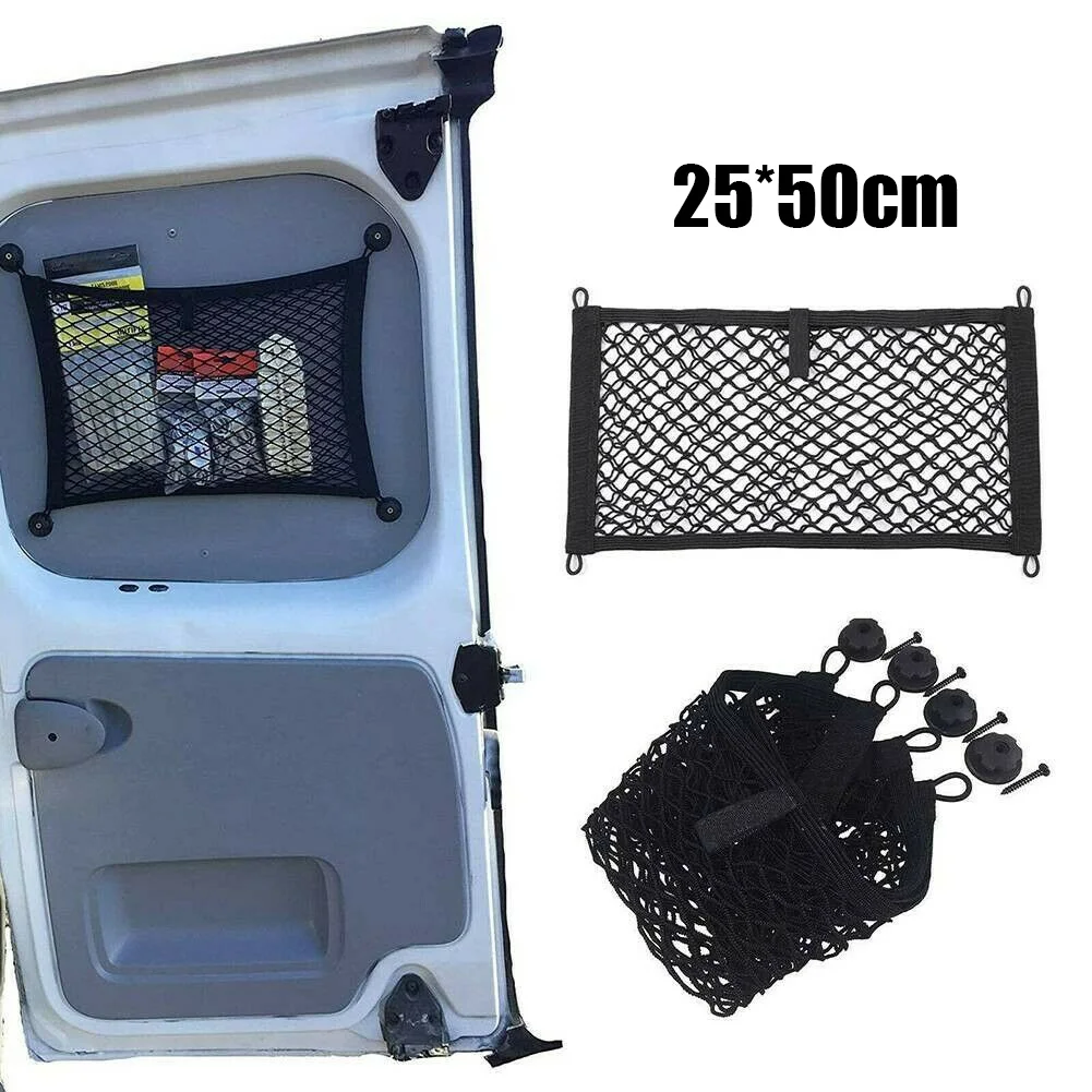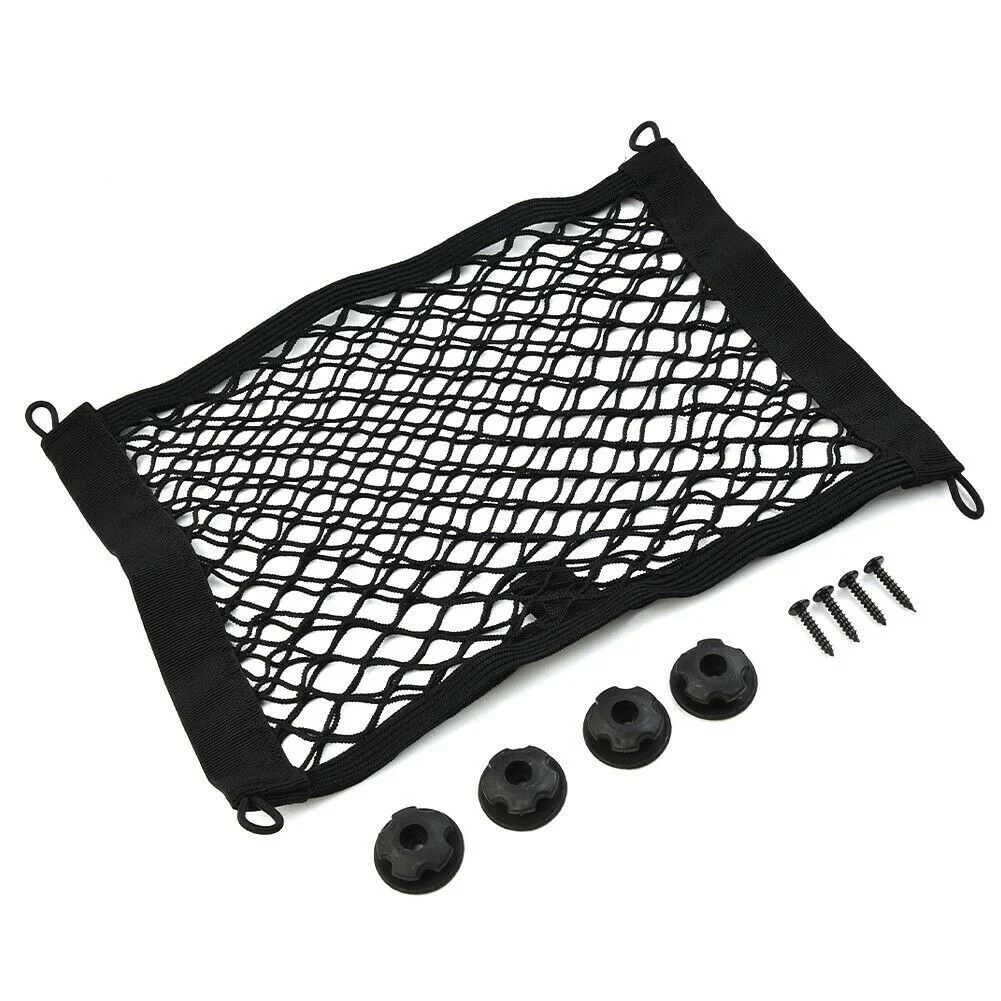 - High-elastic mesh design measuring 25 cm by 50 cm provides flexible storage for various small items efficiently. It stretches to accommodate magazines, bottles, phones, and debris without tearing or sagging.
