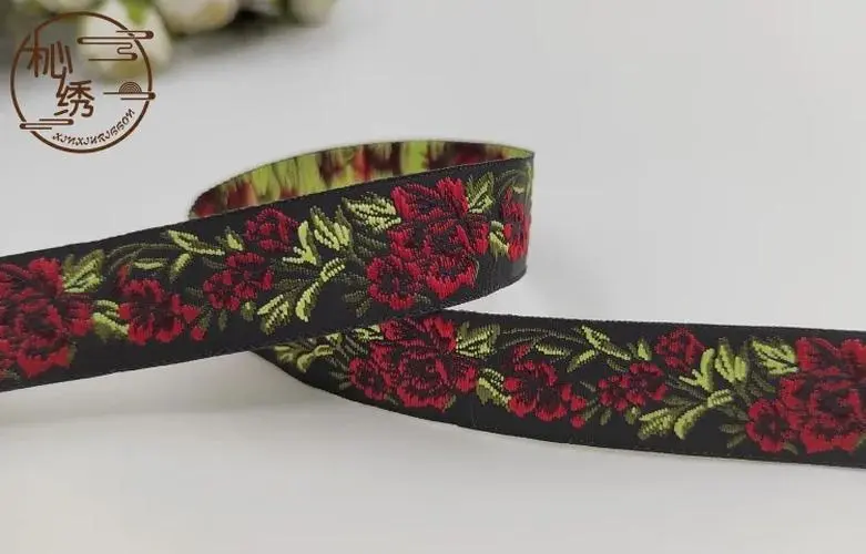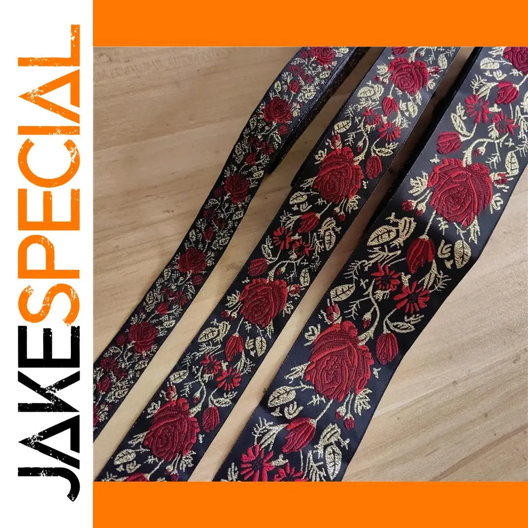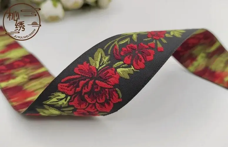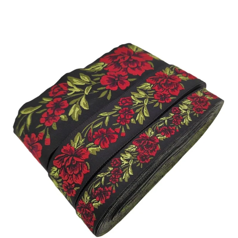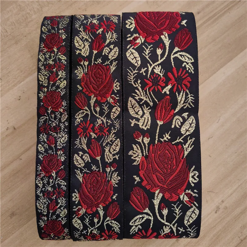 This exquisite golden rose embroidered jacquard ribbon trim set showcases an astonishing blend of craftsmanship and elegance. Predominantly black in color, the ribbons feature intricate floral patterns in vibrant red with delicate gold accents. Spanning widths of 20mm, 33mm, and 50mm, each ribbon offers a unique visual appeal perfect for various decorative needs. The detailed embroidery highlights both large and small rose motifs, accented with lush green leaves, creating a stunning centerpiece for any project. With a gentle sheen typical of high-quality materials, these soft-touch ribbons are sold in generous 10-yard lengths, ensuring you have ample material for all your creative designs.