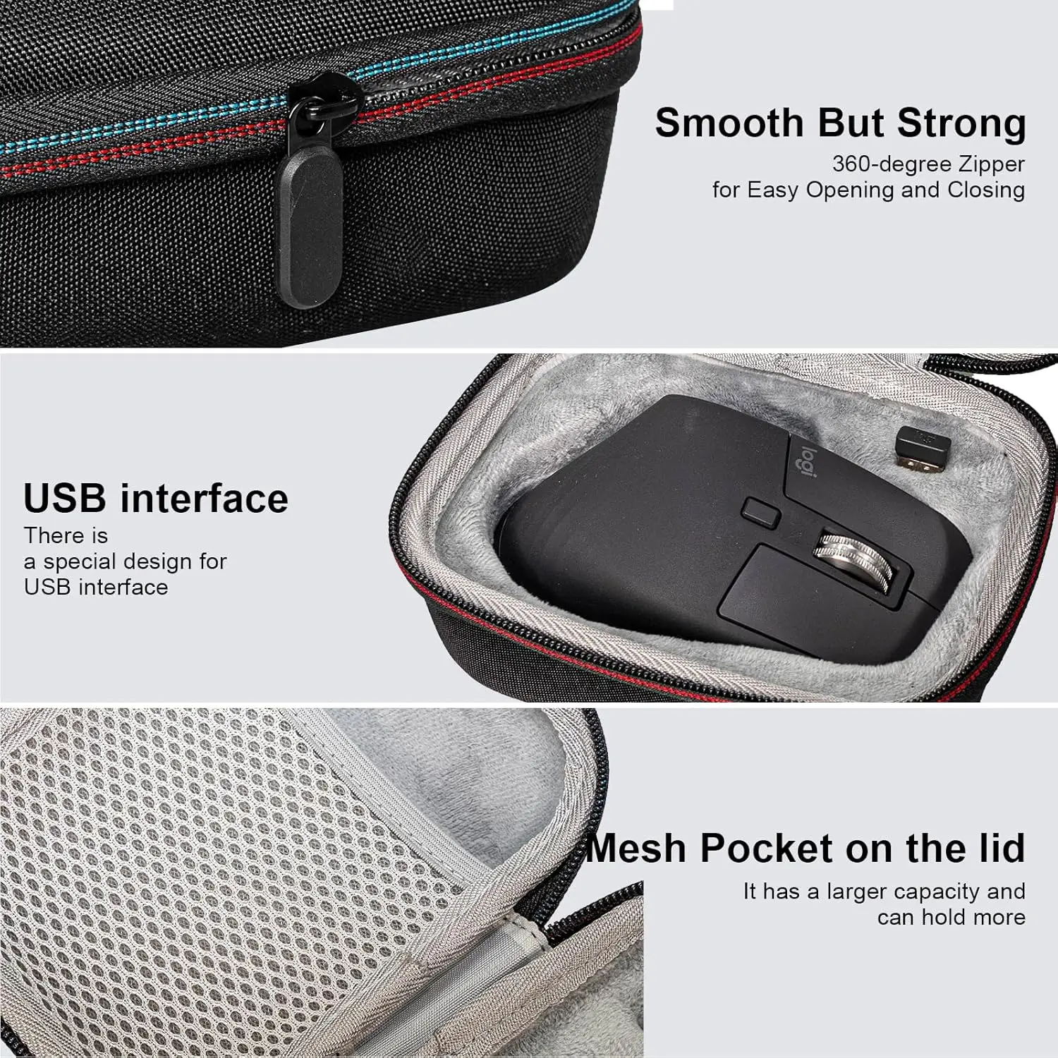 Experience ultimate protection and style with this this black protective case designed specifically for Logitech MX Master 3s, Master 3, and MX Master 2S wireless mice. Crafted from durable, waterproof, and shockproof hard EVA material, it offers long-lasting performance and peace of mind during travel. Its smooth, matte finish exudes sophistication, while the streamlined, rectangular shape ensures easy portability. The sturdy full-zip closure ensures secure sealing, and a convenient handle allows you to carry it effortlessly. Inside, the plush villus lining keeps your mouse scratch-free, complemented by an interior mesh pocket to neatly organize accessories like cables or small peripherals. This case combines practicality and elegance for your valuable device.