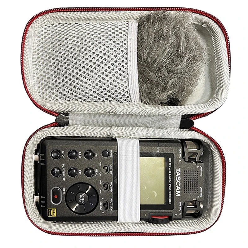 Experience ultimate protection for your TASCAM DR-100MK 3 and DR-100MKIII digital audio recorders with this black EVA hard carrying case. Its sleek and minimalist design combines durability with functionality, providing a secure storage solution. The waterproof and heavy-duty exterior safeguards your audio equipment against the elements, ensuring reliability while traveling or working on projects. The snug compartment, secured by an elastic band, keeps your recorder in place, while the transparent mesh pocket allows easy access to accessories like the included fluffy gray windscreen. With precise dimensions of 190mm x 105mm x 65mm, this lightweight case, weighing only 128g, is an essential companion for audio professionals.