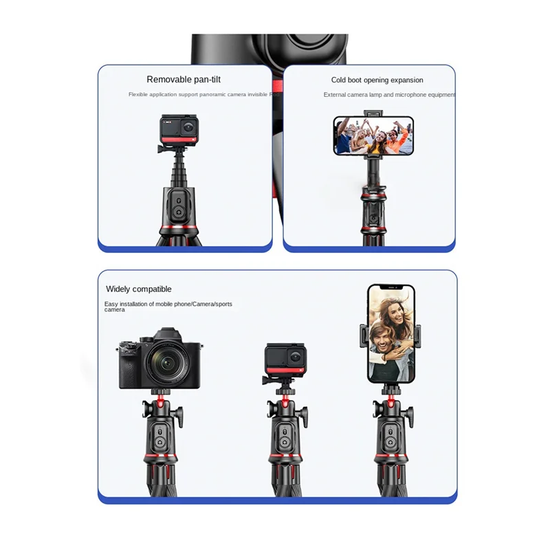 Imagine capturing perfect selfies or stable videos effortlessly with this innovative selfie stick and tripod. Its sleek black design combined with vibrant red accents makes it both stylish and modern. Crafted from durable plastic, the device is lightweight yet sturdy, making it easy to carry on all your adventures. The extendable telescoping sections allow for customizable lengths, while the textured, flexible octopus-like legs can be adjusted to stabilize on any surface or wrap around objects for multifunctional use. The top clamp securely holds smartphones and small cameras with its adjustable mechanism, ensuring compatibility with various models. Its control buttons, including a circular shutter remote, give you seamless remote operation. This compact, versatile gadget guarantees better photos and videos, turning your device into a professional tool.