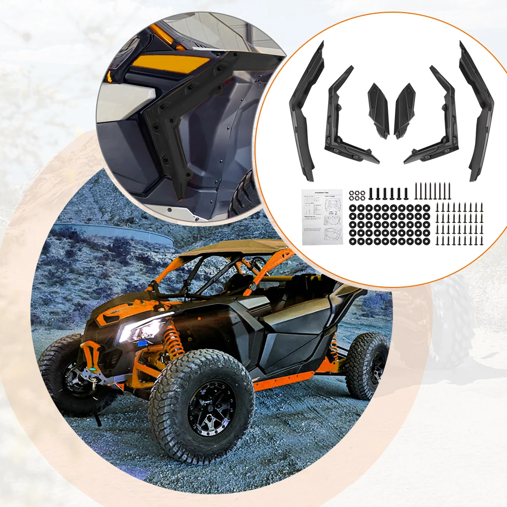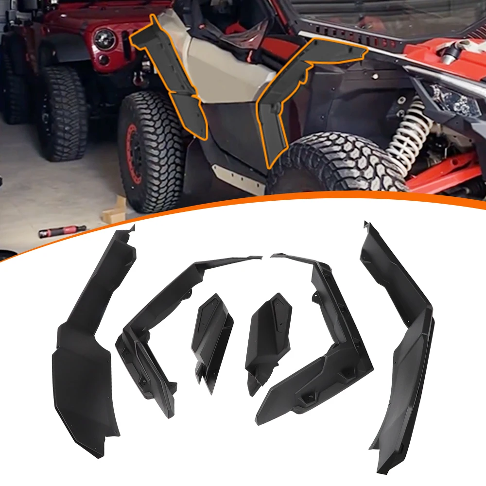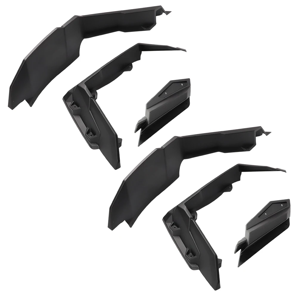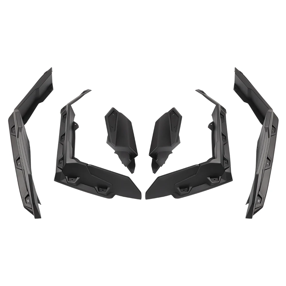 Enhance your Can-Am Maverick X3 from 2017 to 2024 with these sleek, black extended fender flares, designed for Max and Turbo models. Constructed for durability and off-road performance, these flares fit directly inside the fender wells, providing an integrated, aggressive look while offering extra coverage to keep mud, dirt, and debris out. Featuring a streamlined, angular design with subtle ridges and contoured edges, they blend rugged durability with modern style. Quick and easy to install, these fender flares are an essential upgrade for elevating your vehicle’s protection and appearance during desert, rocky trails, or sandy dunes.