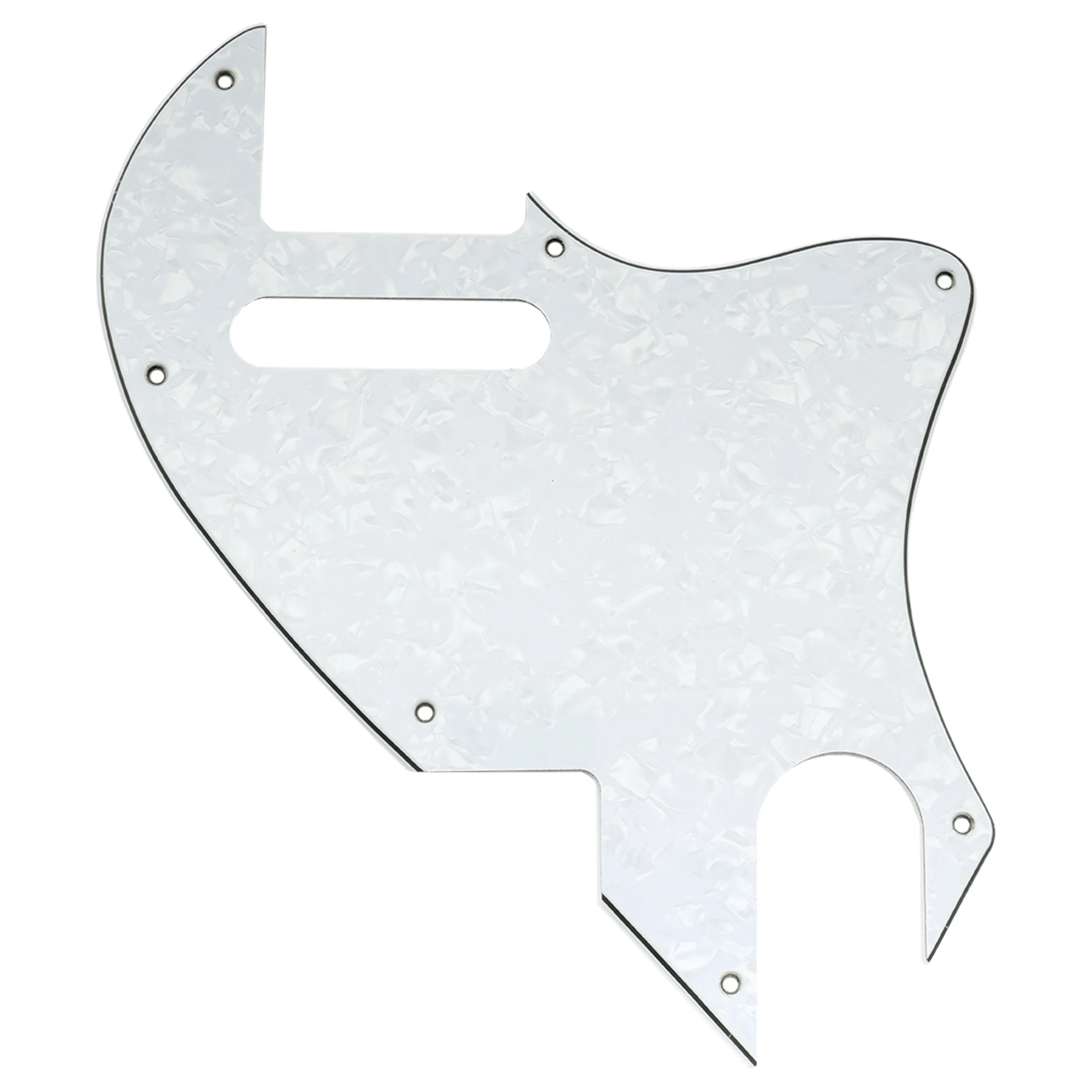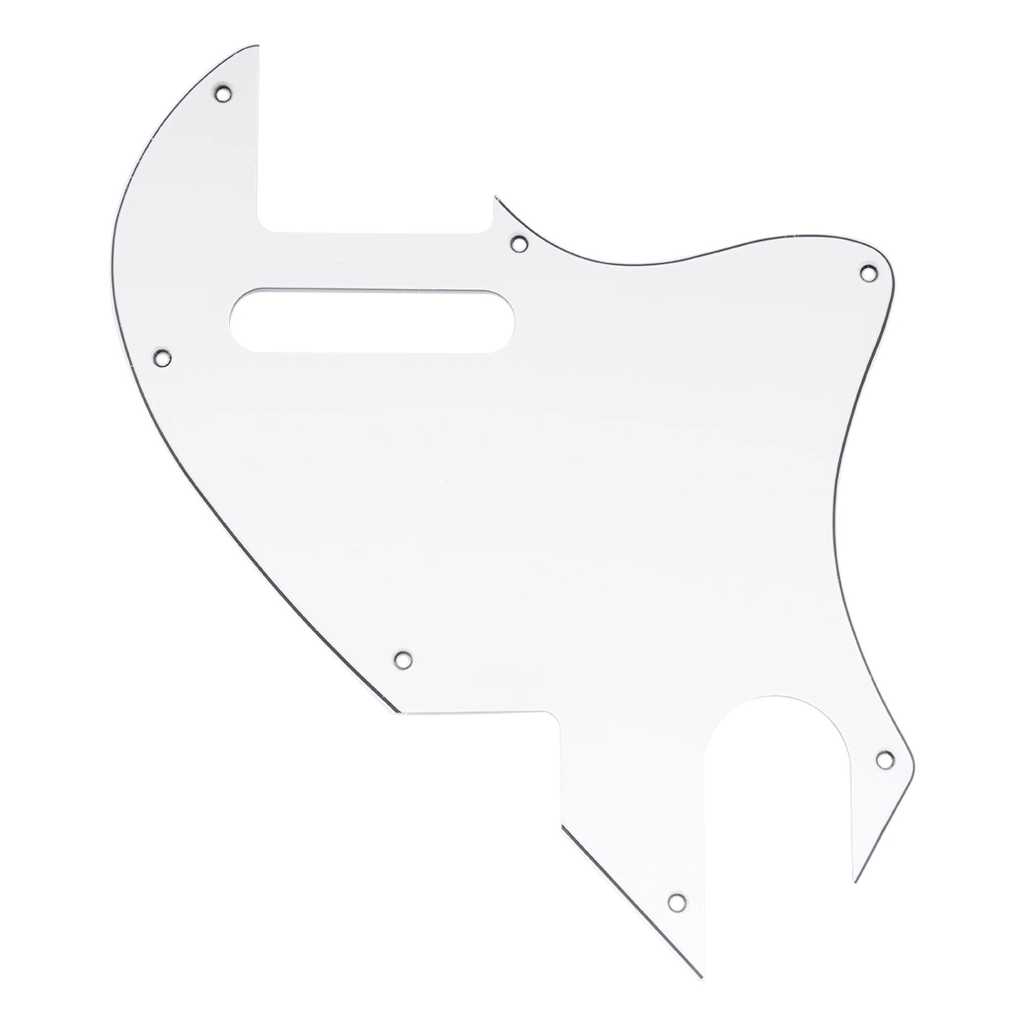 Immerse yourself in the refined style and functional design of this black guitar pickguard, perfect for Fender F-hole hybrid Tele-style electric guitars. Crafted from durable plastic, it boasts a glossy, high-shine finish that enhances your guitar’s aesthetic while protecting it from scratches. Its irregular, asymmetrical shape with smooth, polished edges delivers a modern and unique silhouette, perfectly blending style with practicality. The pickguard measures approximately 2.3mm thick, ensuring durability without adding unnecessary weight. With seven precisely cut mounting screw holes and a rounded corner for the single coil pickup slot, it guarantees a secure fit and seamless integration. Suitable for USA and Mexican models, this pickguard is an essential upgrade or replacement for your instrument.