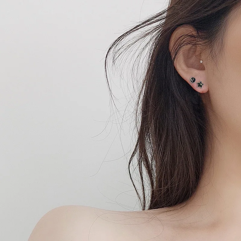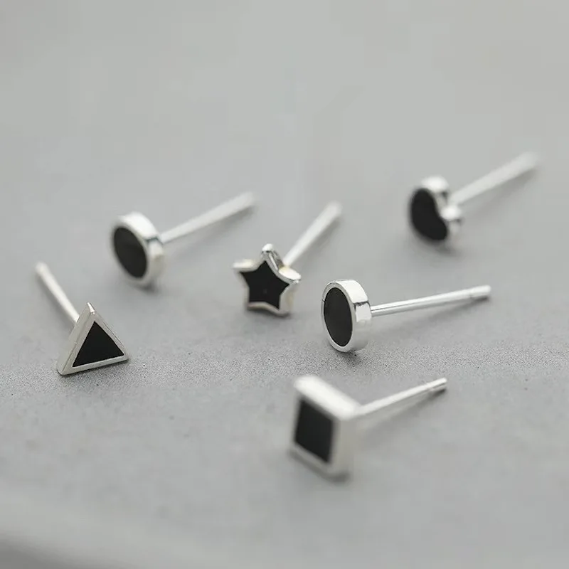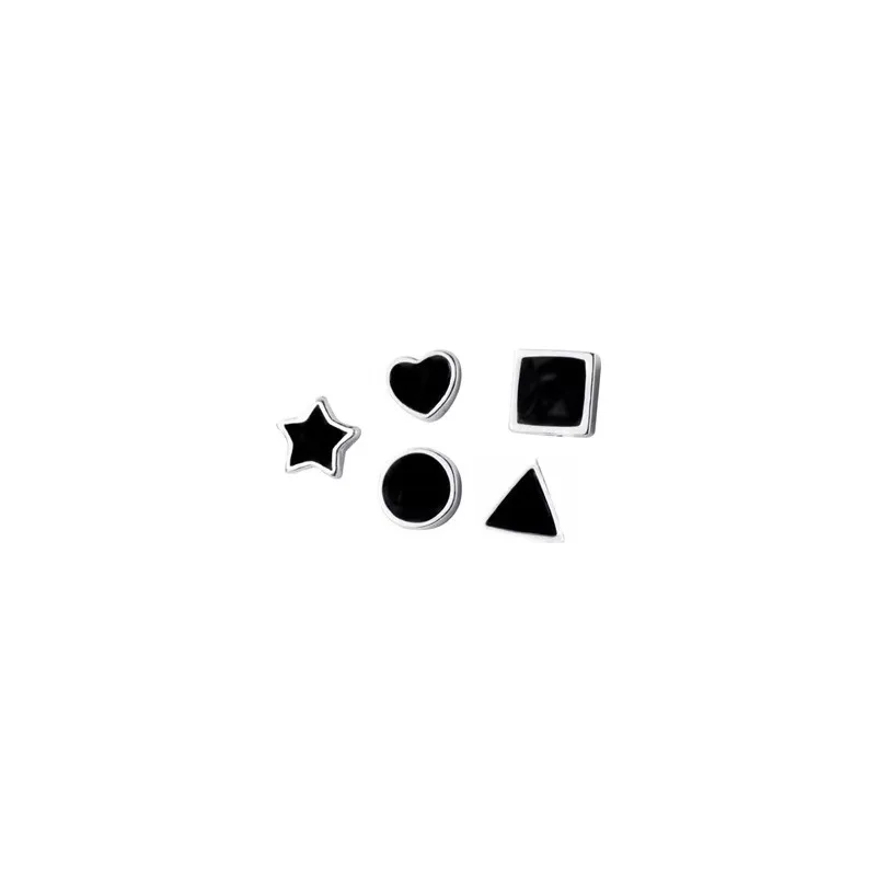 Discover the charm of this trendy and playful earrings set featuring five stylish geometric studs in sleek black enamel finish. Designed for women and girls, these small, modern earrings showcase a variety of shapes—stars, hearts, circles, triangles, and squares—that add a touch of contemporary elegance to any look. Made from zinc alloy, they offer durability and shine with their glossy metallic surface. Perfect for everyday wear or special occasions, this set allows you to mix and match for a chic, personalized style. With a minimalistic aesthetic, these earrings bring a subtle statement of fashion and fun, making them an essential addition to your jewelry collection. Comfortably secure with push-back closures, they’re easy to wear and remove.