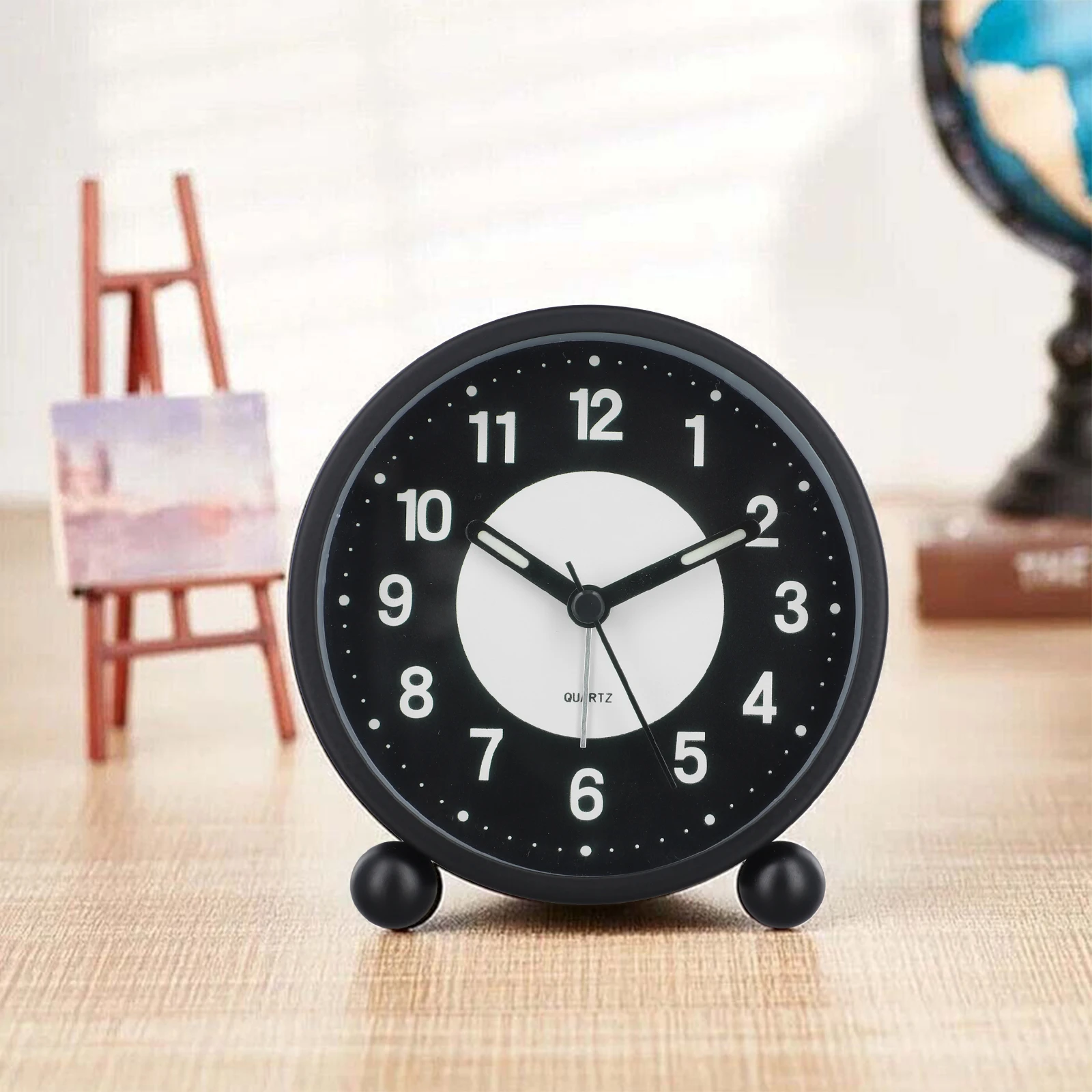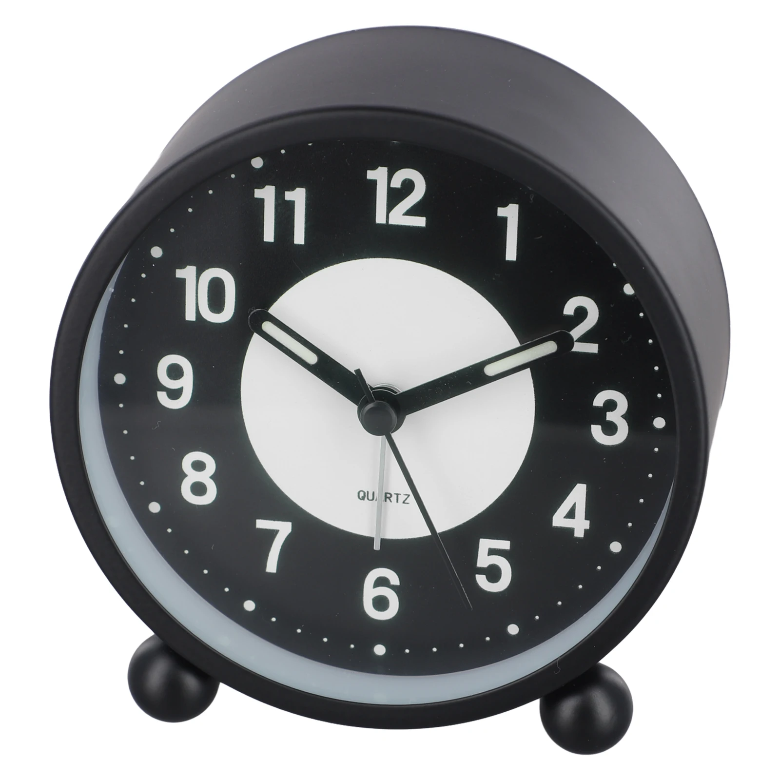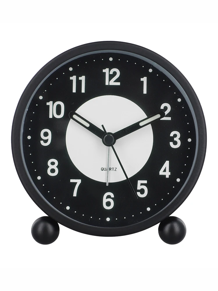 Imagine waking up refreshed every morning, greeted by a softly luminous dial that makes the time easy to read even in complete darkness. This this alarm clock combines minimalist style with practical functionality, making it a perfect addition to your bedside table or children's room. Its matte black finish exudes modern elegance, while the round shape and stable feet add to its charm. Crafted with a durable metal case and plastic dial, it resists drops up to 3 meters, ensuring longevity. The glow-in-the-dark feature is activated by exposure to light or a simple press of the built-in button, providing clarity in the dark. Enjoy a peaceful, silent sleep environment with the non-ticking mechanism that minimizes disturbance.