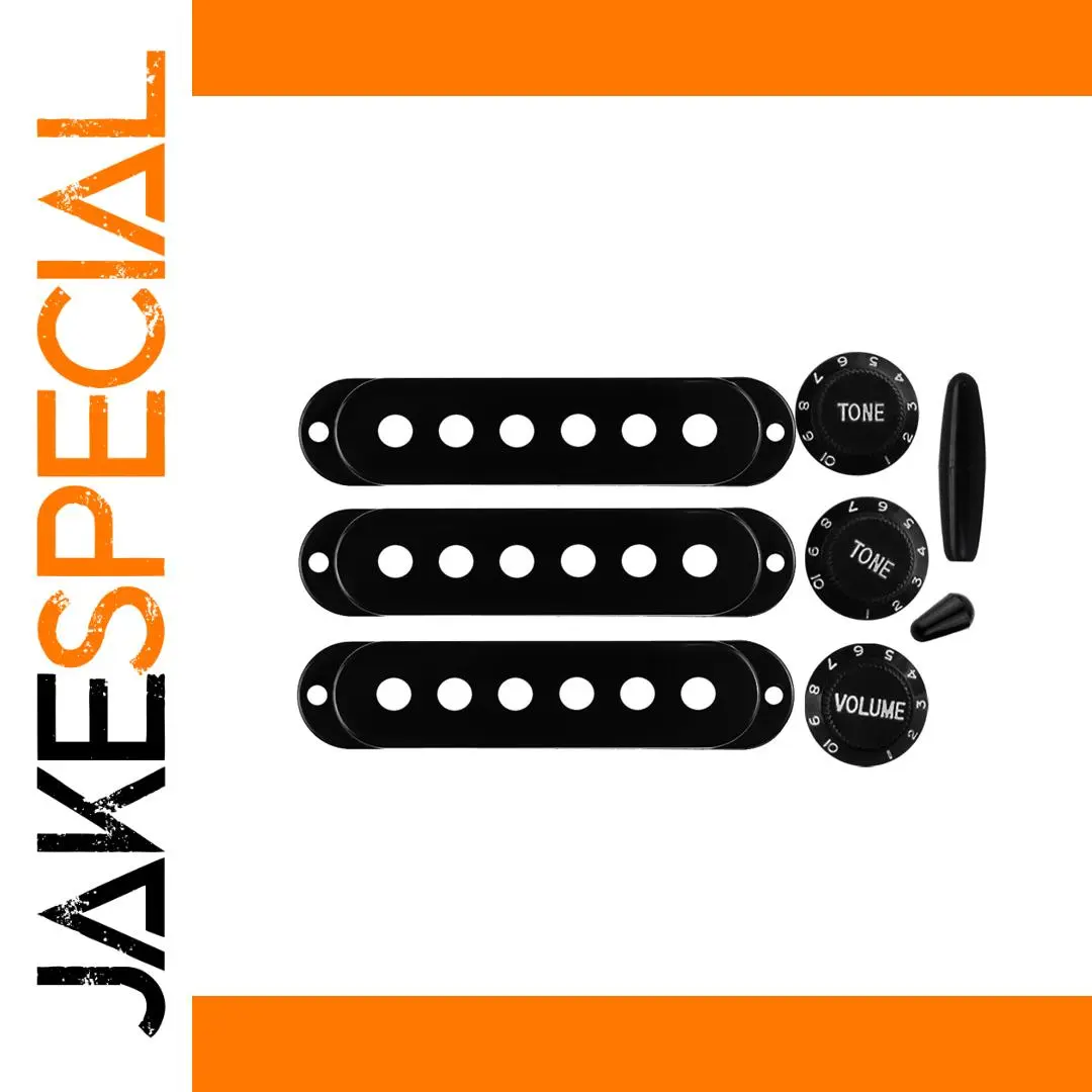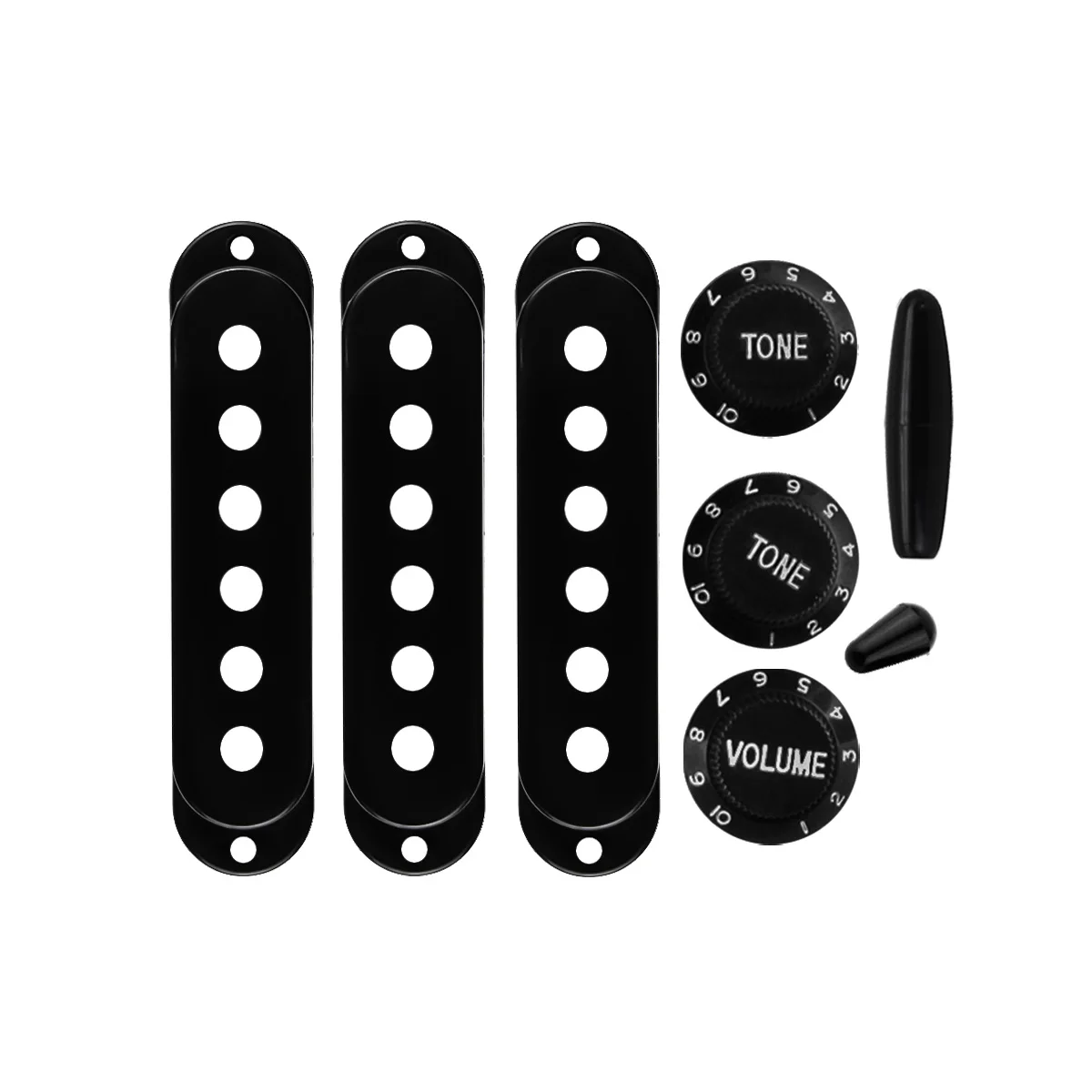 Imagine upgrading your guitar with this sleek, black plastic accessory set that combines style and functionality. The durable, semi-textured finish adds a modern touch to your instrument, providing a seamless look for Floyd Rose or similar ST-style guitars. The set includes three elongated, oval-shaped pickup covers with circular holes, sized at either 50mm or 52mm, allowing you to customize based on your pickup's pole spacing. The two control knobs, labeled “TONE” and “VOLUME,” feature white numbering from 0 to 10 and a textured grip for easy adjustment. Completing the kit, the switch tip and tremolo bar tip are tapered for smooth toggling and enhanced comfort. This comprehensive set is perfect for replacement or custom modification, giving your guitar a refined, professional appearance.