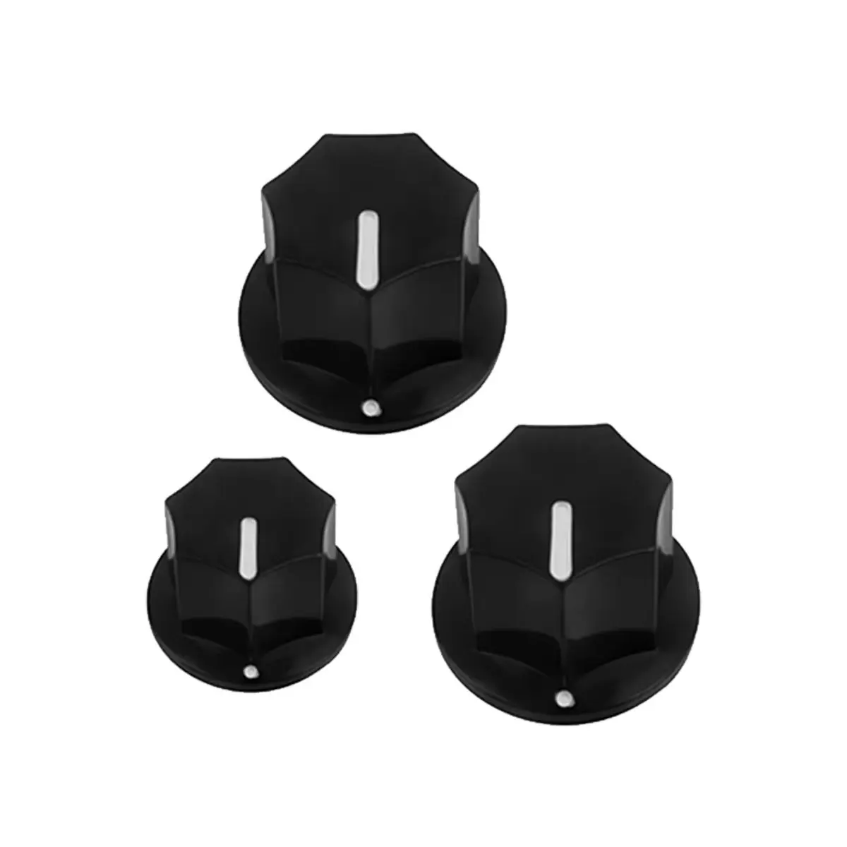 - All knobs feature a central hexagonal cavity for secure fitting onto control shafts, ensuring sturdy attachment during performances or adjustments.