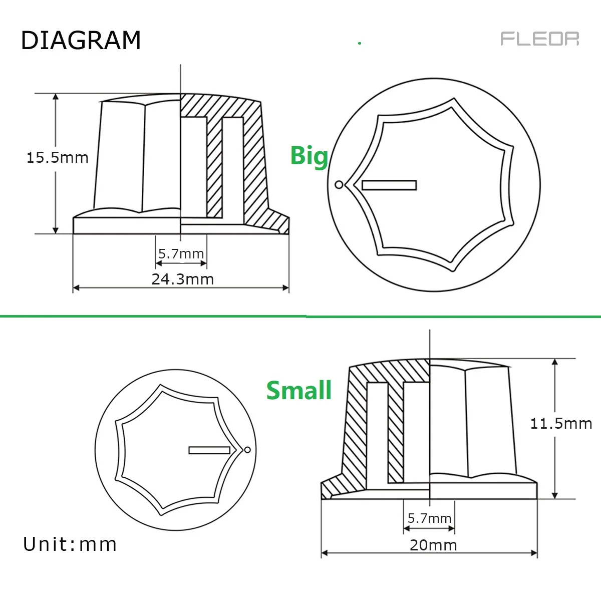 - Technical specifications include: small size 20mm x 11.5mm, large size 24mm x 15.5mm, compatible with many effect pedals, amps, and control units requiring hexagonal-shaft fittings and precise adjustments.