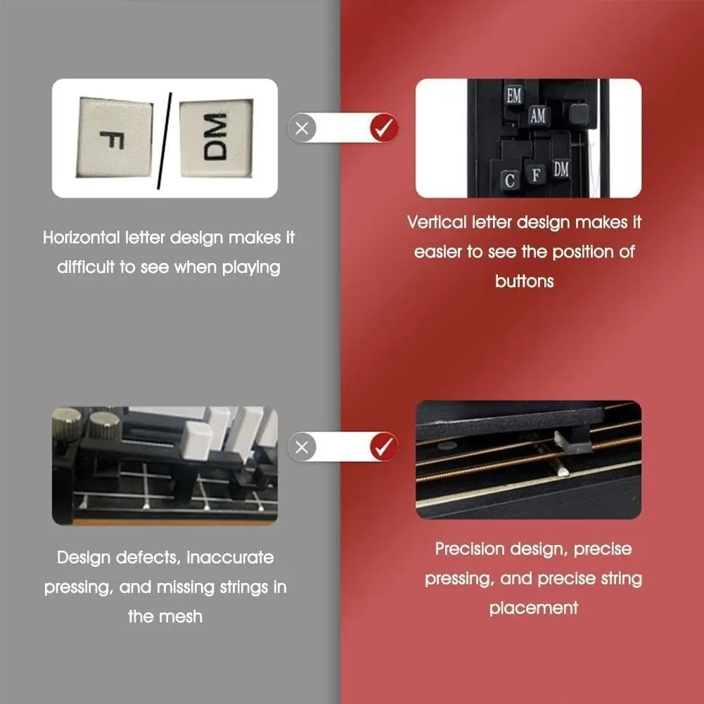 - Contains multiple labeled, rubberized buttons for a wide range of chords like D, Dm, F, Bm, C, Am, and more to support versatile learning.