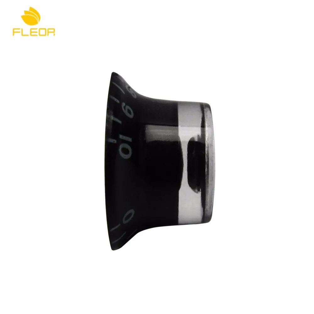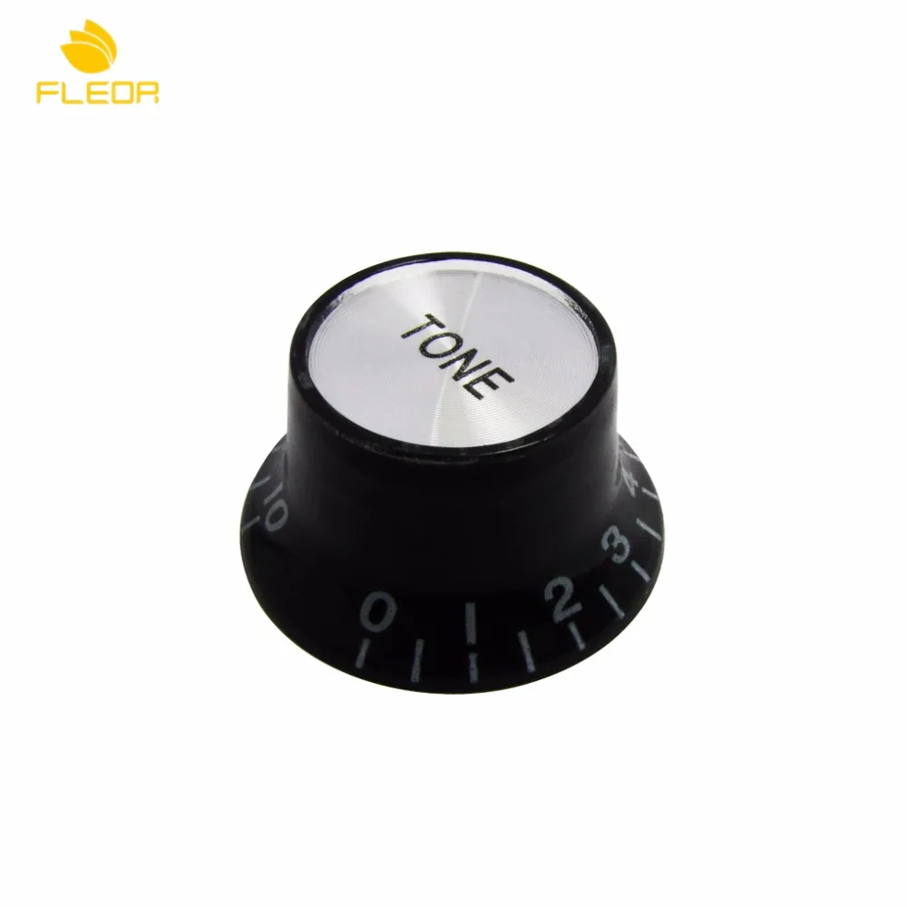 Step up your guitar customization with these sleek, modern black guitar knobs, designed for LP and SG style electric guitars. Crafted from durable acrylic and aluminum sheet, these knobs feature a sophisticated matte black finish that complements any instrument. The circular top surface, with a brushed metallic look, measures approximately 18.5 mm in diameter, offering a refined aesthetic. The conical, tapered body widens to about 26.5 mm at the base, providing a comfortable grip for precise control. Graded with white numerical markings from 0 to 10, and engraved or printed black text indicating “TONE” and “VOLUME,” these knobs combine functionality with style. They are easy to install, fitting standard 6 mm potentiometer shafts. Transform your guitar’s look and feel effortlessly with these premium quality controls.