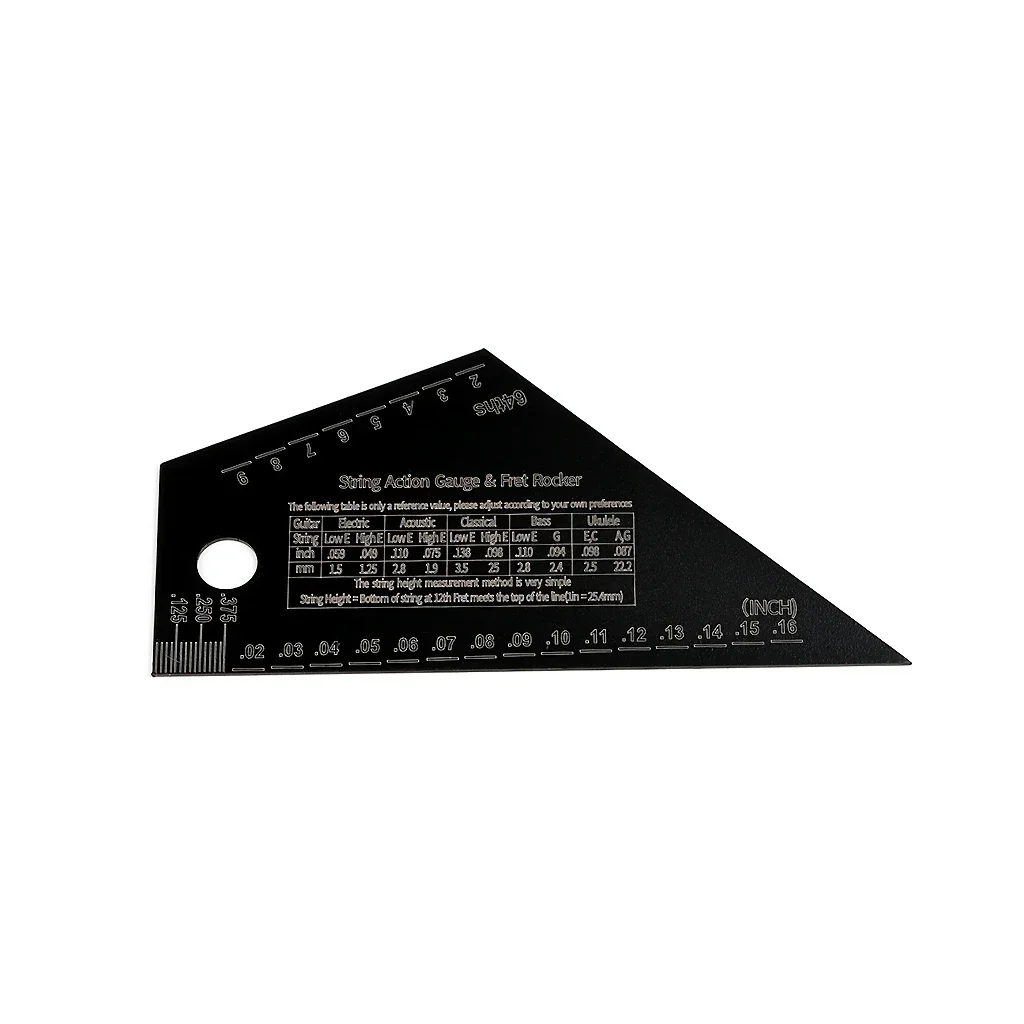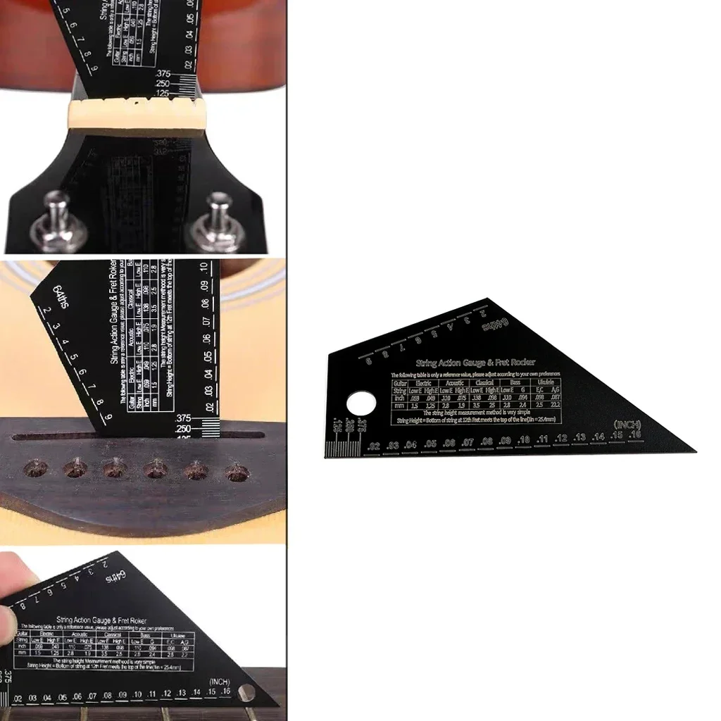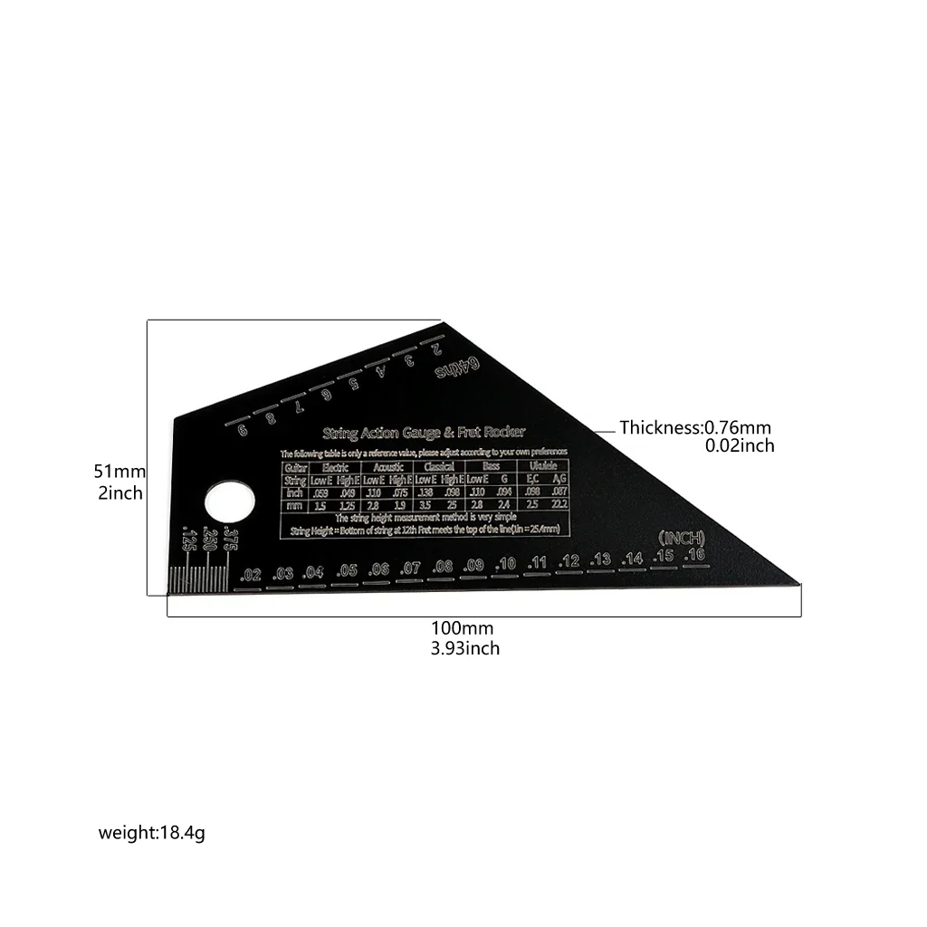 This professional guitar fret rocker tool is crafted from durable metal with a sleek black finish, measuring 100mm x 52mm x 0.76mm. It features clear white graduation markings along its edges for precise measurement of fret crown height, string height, saddle slot depth, pickup pole piece distance, and nut height. Designed for electric guitars, basses, acoustic guitars, mandolins, and banjos, it offers flat, smooth edges for accurate fret leveling and setup, ensuring optimal instrument performance. Its minimalist, streamlined design emphasizes durability and precision, making it an essential tool for guitar enthusiasts and professionals aiming for precise instrument maintenance and setup.