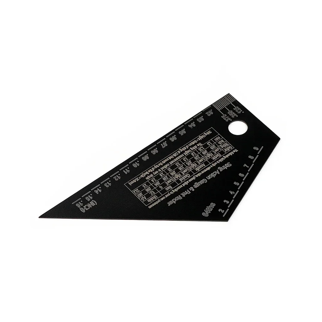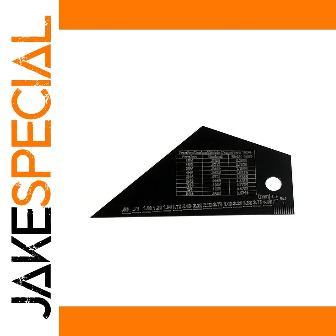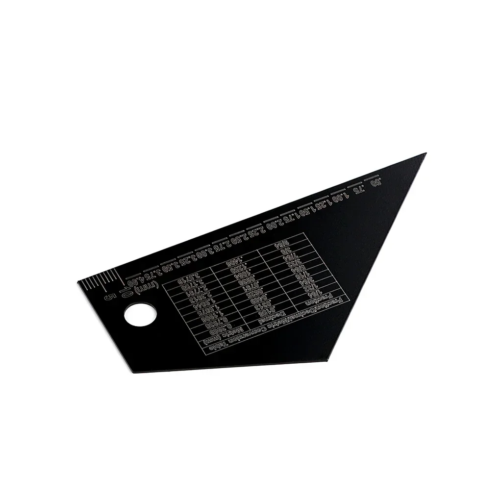 This professional guitar fret rocker tool is crafted from durable metal with a sleek black finish, measuring 100mm x 52mm x 0.76mm. It features clear white graduation markings along its edges for precise measurement of fret crown height, string height, saddle slot depth, pickup pole piece distance, and nut height. Designed for electric guitars, basses, acoustic guitars, mandolins, and banjos, it offers flat, smooth edges for accurate fret leveling and setup, ensuring optimal instrument performance. Its minimalist, streamlined design emphasizes durability and precision, making it an essential tool for guitar enthusiasts and professionals aiming for precise instrument maintenance and setup.