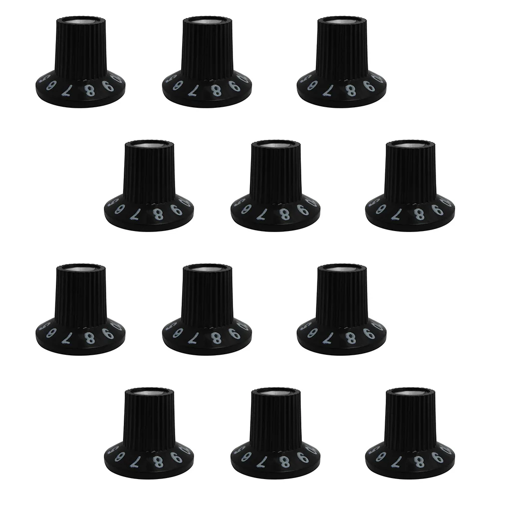 Imagine seamlessly enhancing your guitar or amplifier with these sleek black knobs, making adjustments effortless and stylish. Crafted with a modern aesthetic, they feature a matte black plastic body complemented by shiny, metallic silver tops that catch the light. The ridged edges ensure a secure grip, allowing you to tweak your sound precisely during performances or recordings. The white numerals clearly indicate levels, adding a professional touch. Designed for durability, these knobs fit standard 6mm split shafts, making installation straightforward on a range of guitar effects pedals and amplifier controls. Whether you're customizing your gear or replacing worn parts, these knobs combine functionality with a minimalist style that complements any setup. Feel confident knowing you are upgrading with high-quality components.