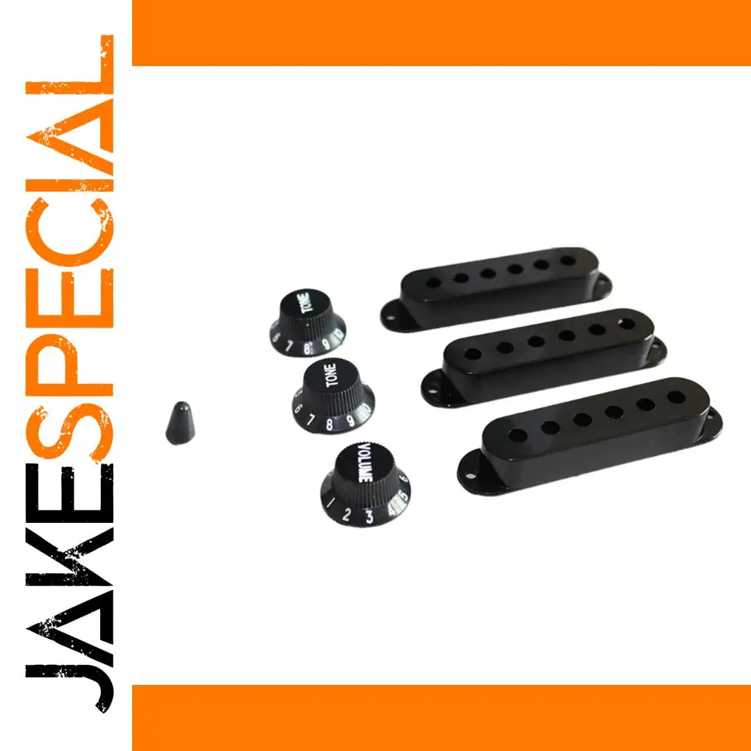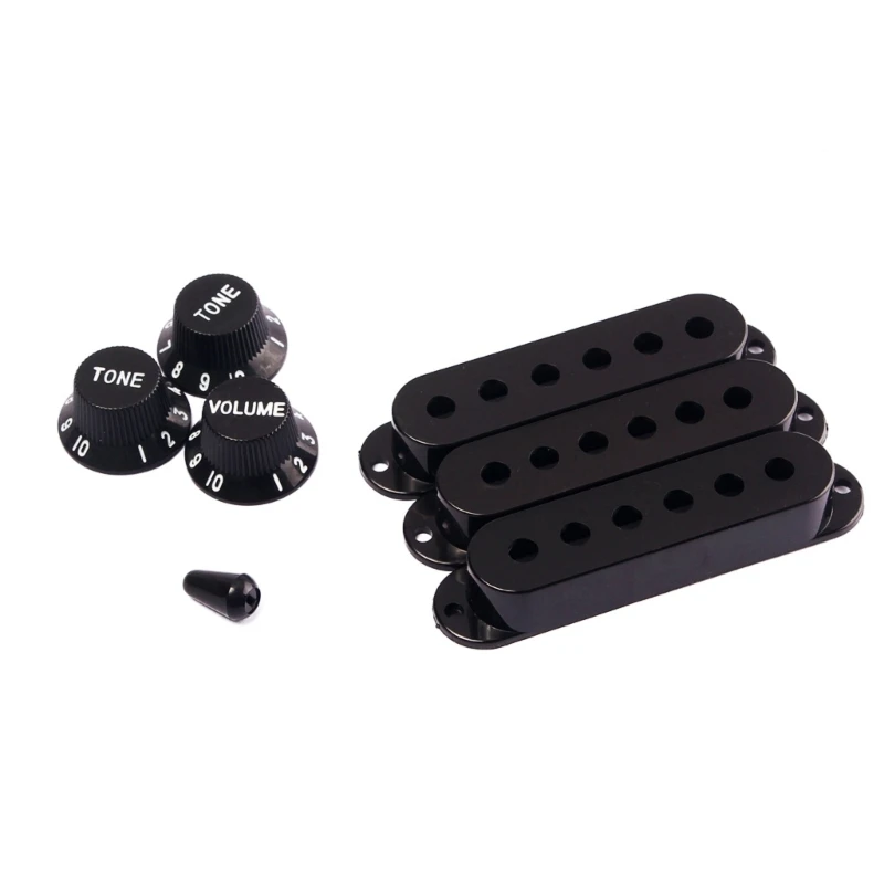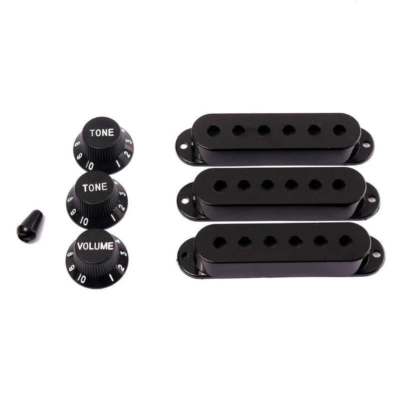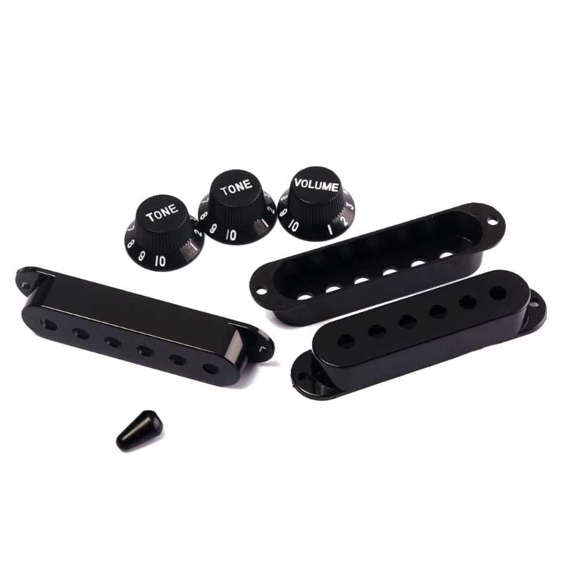 - Technical specifications include: pickup covers made of ABS, knobs with white numerals on black, switch tip designed for toggle switches, all in a sleek black finish.