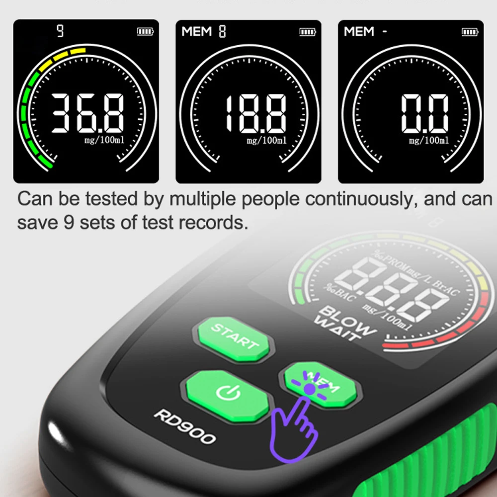 - Supports six measurement units—mg/100ml, %BAC, mg/LBrAC, ‰BAC, g/L, and ‰PROM—and features a memory function that stores nine recent tests, with a power-off save option.