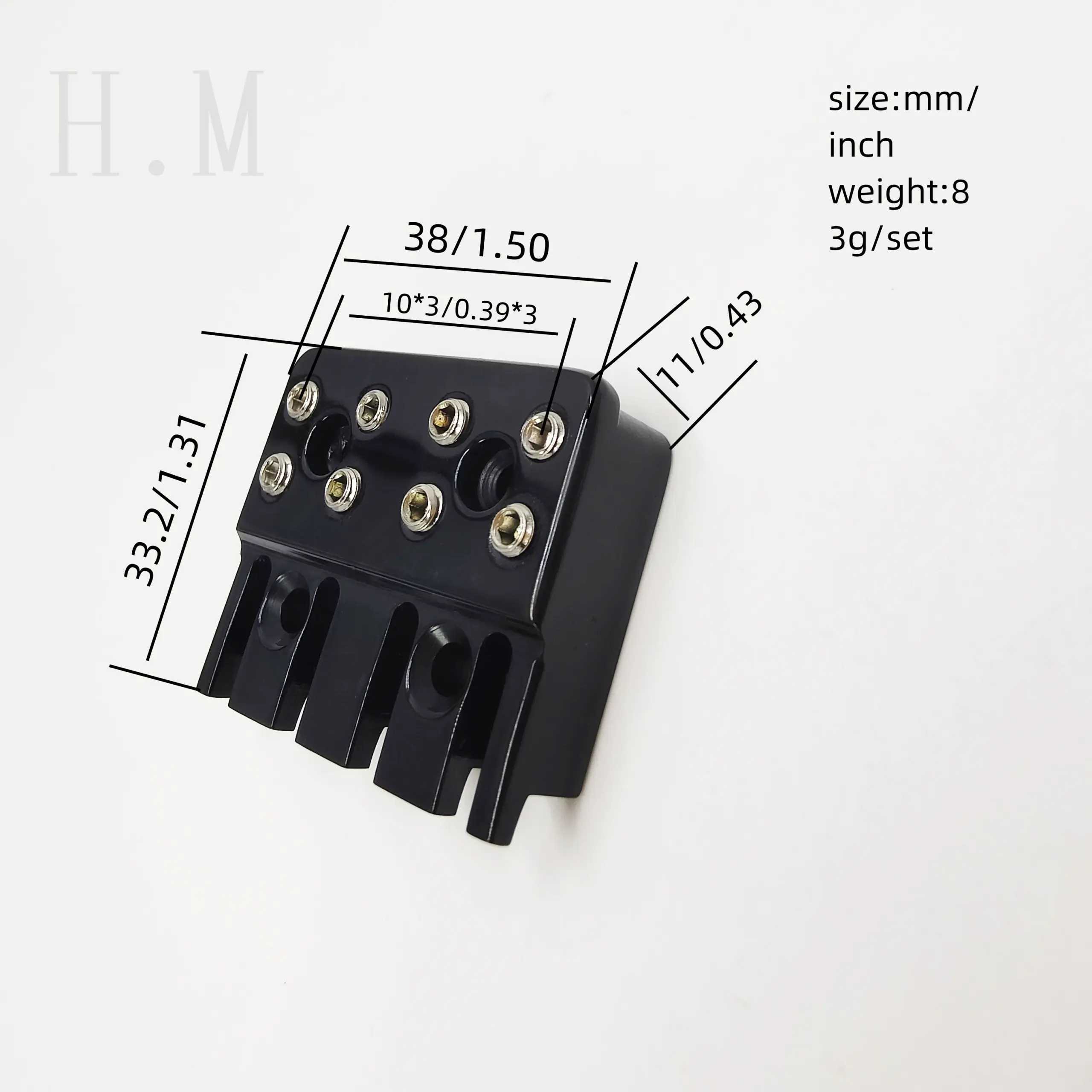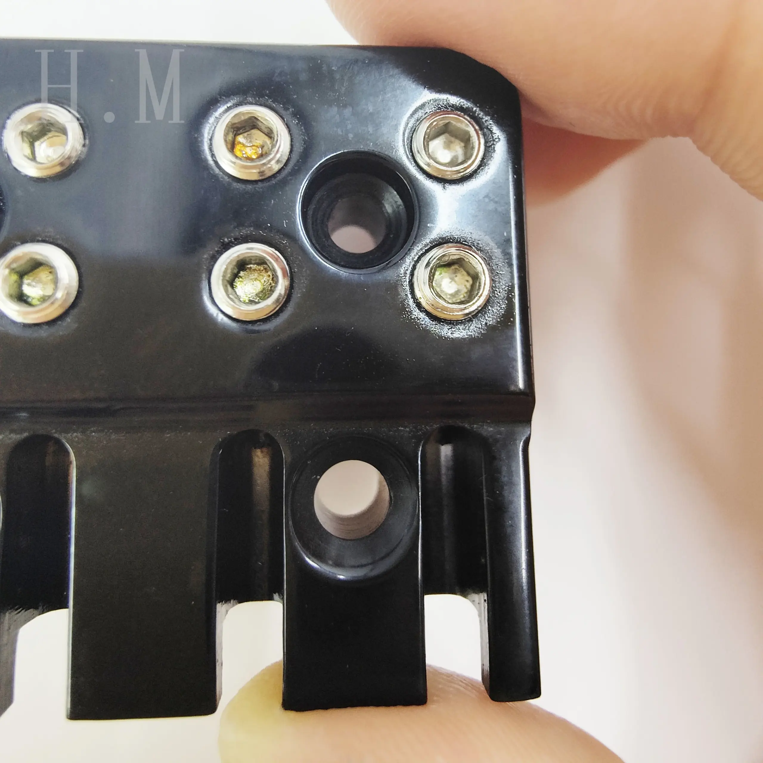 - Features a single, integrated bridge design with two central holes, each surrounded by six small, metallic screws or bolts, reinforcing the structure and enabling easy adjustments.
