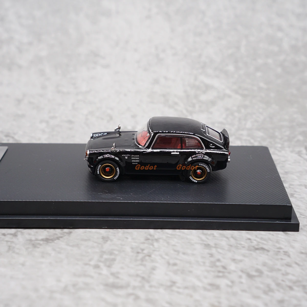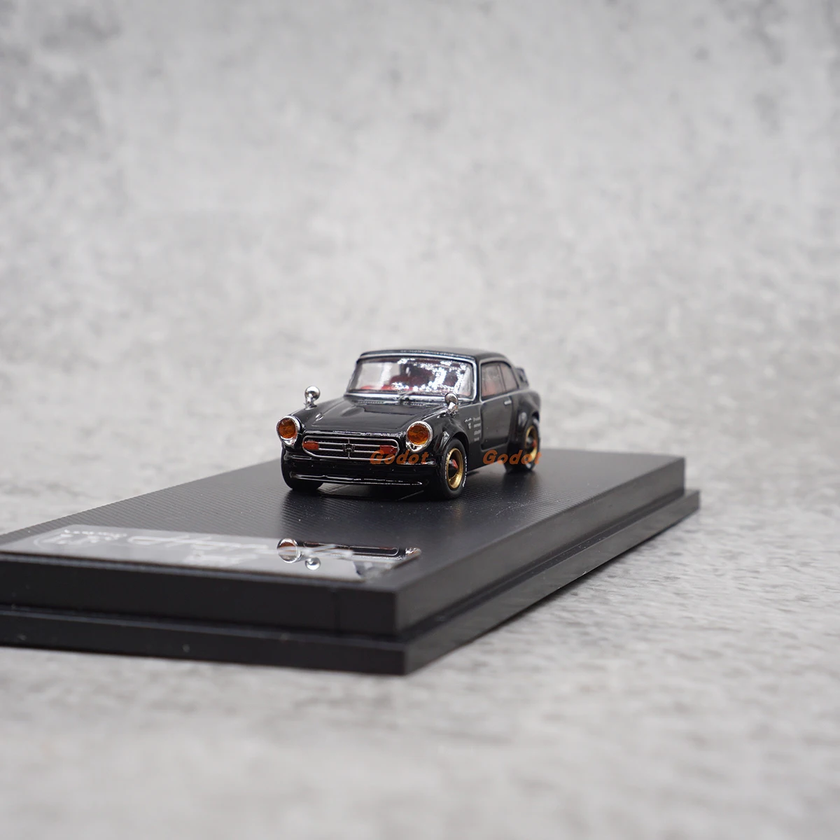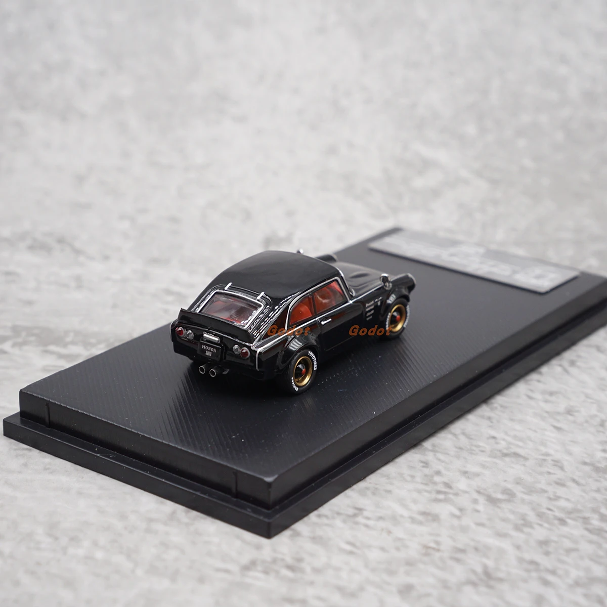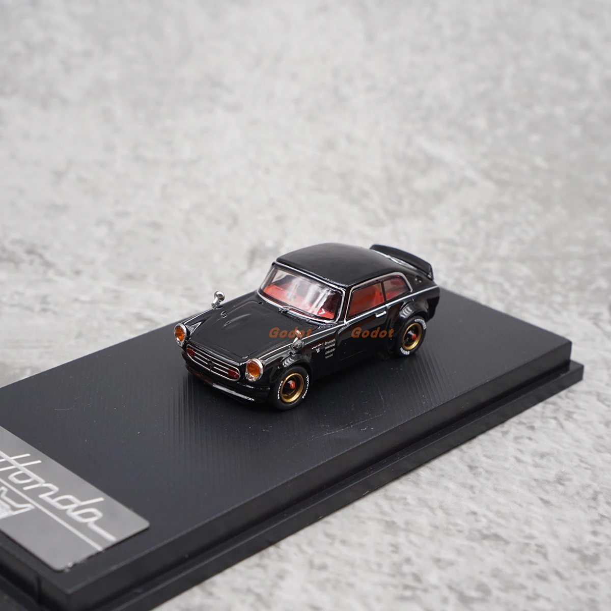 - Exquisitely painted monochrome black with light red accents visible through transparent side windows, echoing the vintage aesthetic of the classic Honda S800 Coupe.