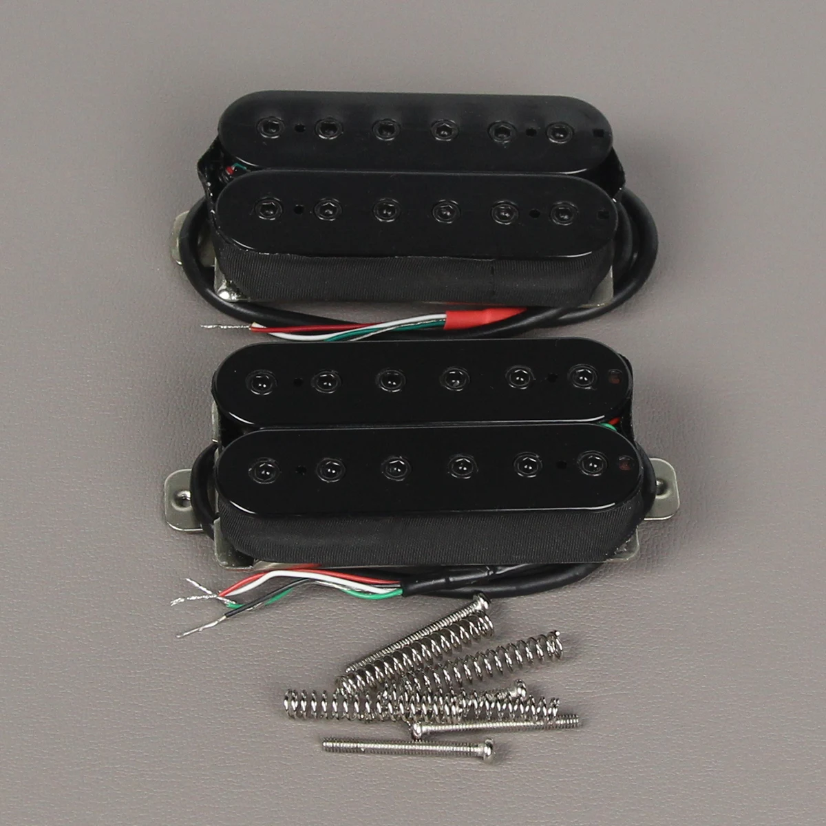 Experience the perfect blend of style and sound with this set of black open humbucker pickups, designed for advanced guitarists seeking versatility and high-quality tone. Featuring sleek, matte black rectangular bodies with rounded edges, these pickups exude a modern minimalist aesthetic. The open-coil construction reveals intricate internal components, giving an industrial and technical appeal that appeals to dedicated musicians. Equipped with Alnico 5 magnets, they produce warm, powerful sound suitable for various genres. The set includes neck and bridge pickups with resistance values of 7K and 14K ohms respectively, ensuring dynamic output. Meanwhile, the colorful wires—green, red, black, and white—add visual flair and facilitate multiple wiring options. Properly sealed and mounted, these pickups seamlessly fit most double humbucker guitar models, elevating your playing experience to new heights.