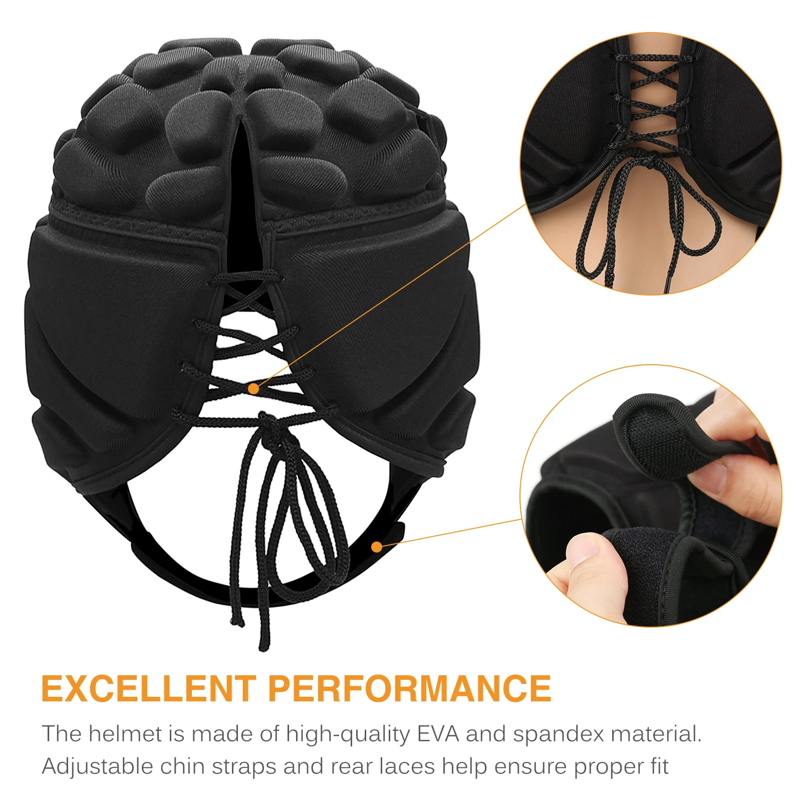 Experience superior head protection with this lightweight goalkeeper helmet, weighing approximately 88 grams (3.1 ounces) and available in Medium (55 cm/21.5″), Large (60 cm/23.5″), and Extra Large (65 cm/25.5″) sizes. Crafted from durable EVA foam and breathable spandex fabric, it features EVA cell pads for optimal shock absorption, an adjustable rear drawcord for a tailored fit, and a secure, adjustable chin strap. Designed to provide reliable impact dispersion and comfort during football, soccer, rugby, and similar sports, this sleek, ergonomic helmet combines rugged protection with a modern aesthetic, making it an essential gear for serious goalkeepers.
