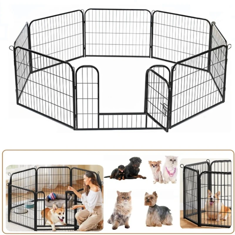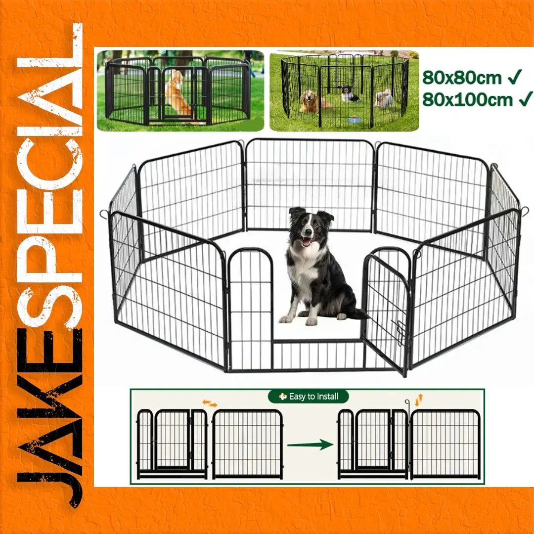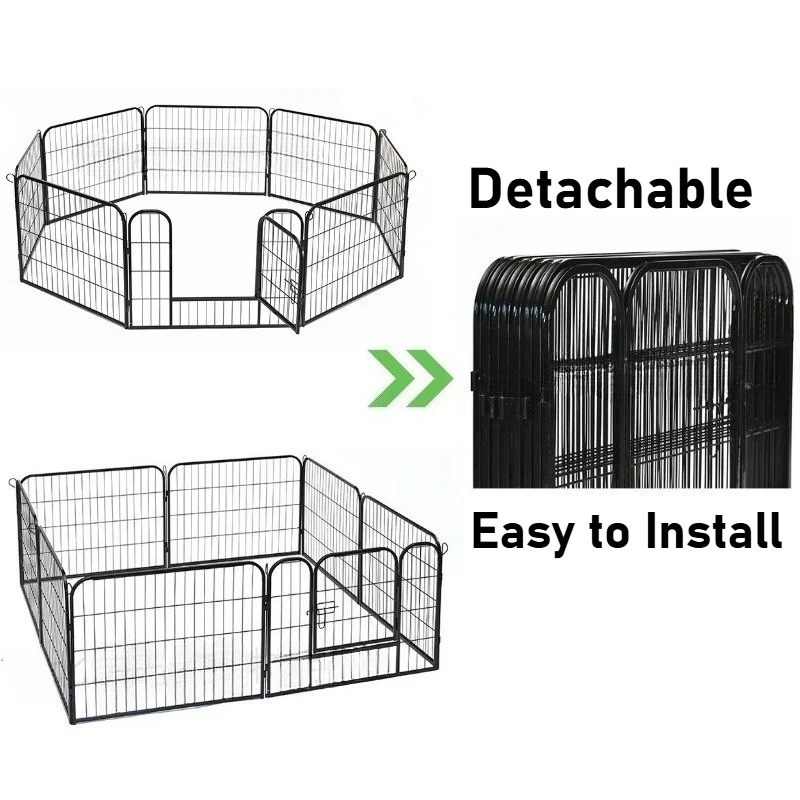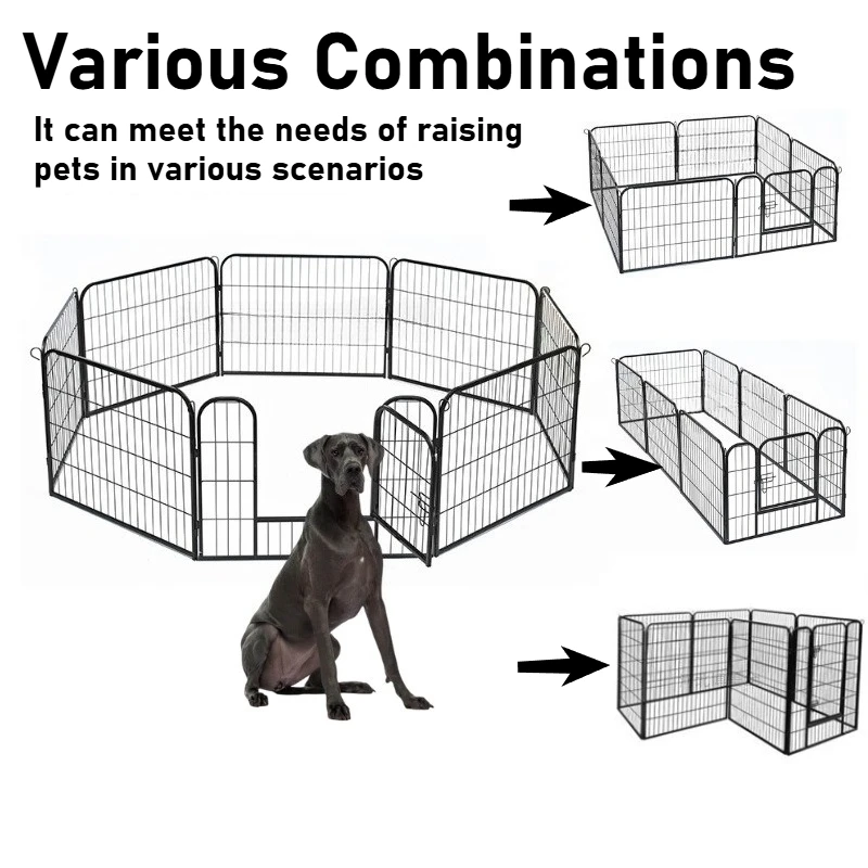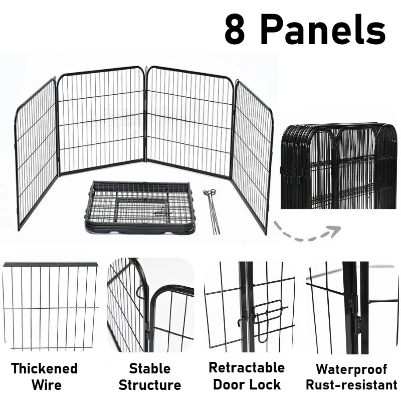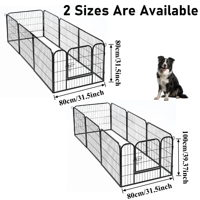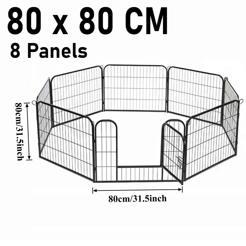 - This pet fence features 8 foldable iron panels in two sizes: 80×80 cm and 80×100 cm, allowing customization for your pet's space indoors or outdoors.