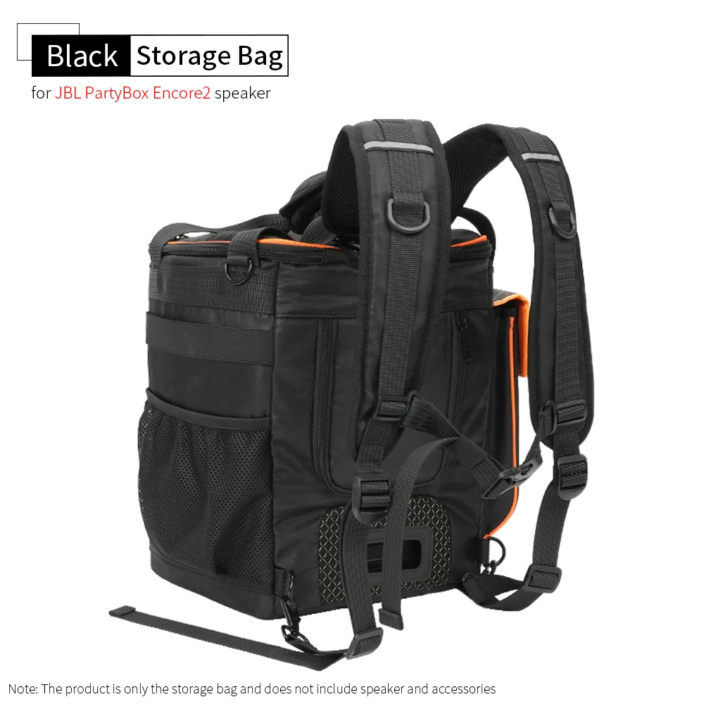 Experience peace of mind with this sleek, black storage bag designed specifically for the JBL PartyBox Encore 2 speaker. Crafted from high-quality, durable fabric with a smooth, slightly glossy finish, this bag offers reliable protection for your valuable audio equipment. Its precise mold making and exquisite workmanship ensure a perfect fit, keeping your speaker secure during transport. The bag features a rectangular shape with reinforced edges, adding to its sturdy and streamlined design. A vibrant orange piping outlines the small front zippered pocket, providing a striking contrast and easy access to accessories. The large mesh-covered side section adds a modern touch, enhancing ventilation and style. Ideal for enthusiasts who value both functionality and aesthetics when transporting their portable speaker. Its compact dimensions of 27x21x37 cm make it easy to carry and store with confidence.