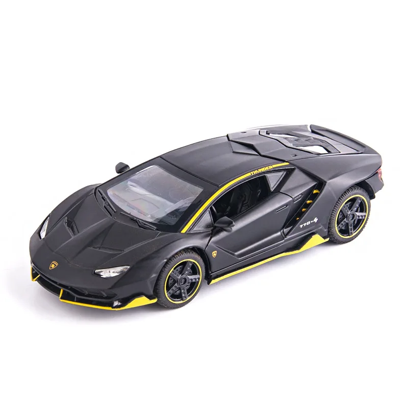 Experience the thrill of owning a meticulously crafted 1:32 scale Lamborghini LP770 diecast model. Finished in a sleek, glossy black with vibrant yellow accents, this collectible perfectly captures the aggressive and sporty aesthetic of the real supercar. With sharp, angular lines and a low-profile stance, it exudes modern sophistication and dynamic energy. The realistic metallic sheen enhances its visual appeal, making it a perfect display piece. The detailed alloy and plastic construction ensures durability, while the functional doors, pull-back movement, sound, and light effects add an interactive touch to your collection. Whether for display or as a gift, this model embodies high-end craftsmanship and intricate design, making it a truly captivating addition to any collection.