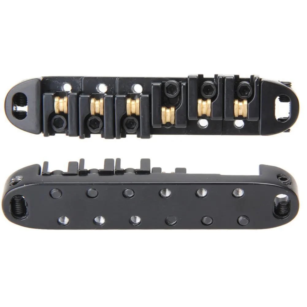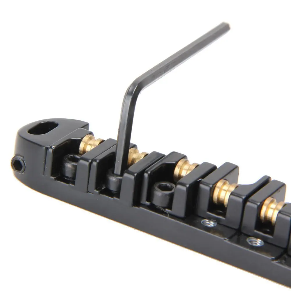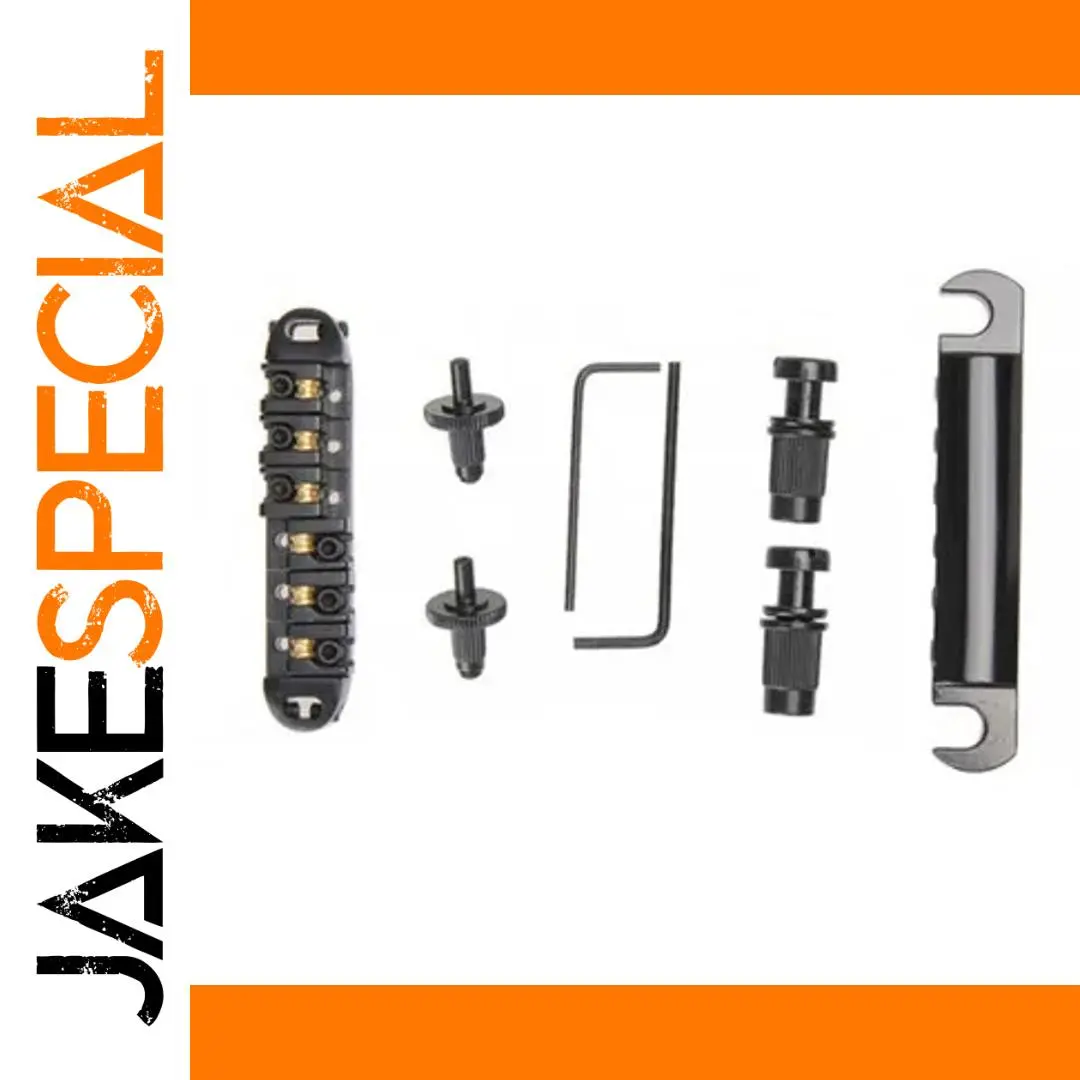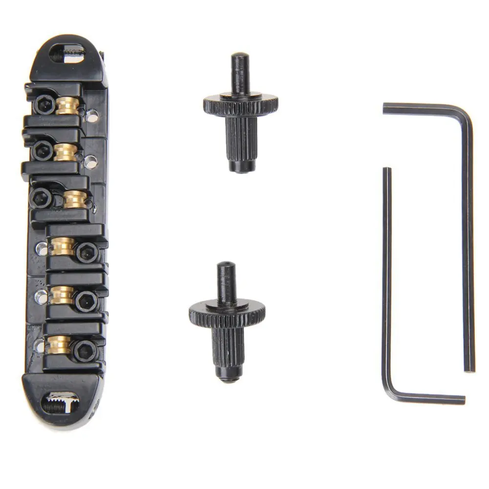 Enhance your LP electric guitar with this durable 6-string black alloy bridge tailpiece set, designed for seamless performance and reliable tuning stability. The set includes an upper string bridge, lower bridge seat, four precision-positioning columns, and two wrenches, all crafted with a sleek matte black finish that complements any guitar style. Measuring 10 cm in length, 1.6 cm in width, and 1 cm in height, this robust component ensures smooth string movement with its roller-style design. Perfect for replacing or upgrading your guitar’s bridge system, it delivers both technical precision and an industrial aesthetic, making your instrument look and perform its best.