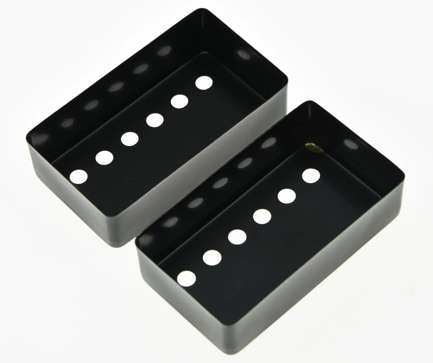 - Set of two black metal pickup covers designed for LP-style humbuckers, measuring exactly 70mm in length, 38.5mm in width, and 20mm in height for a perfect fit.