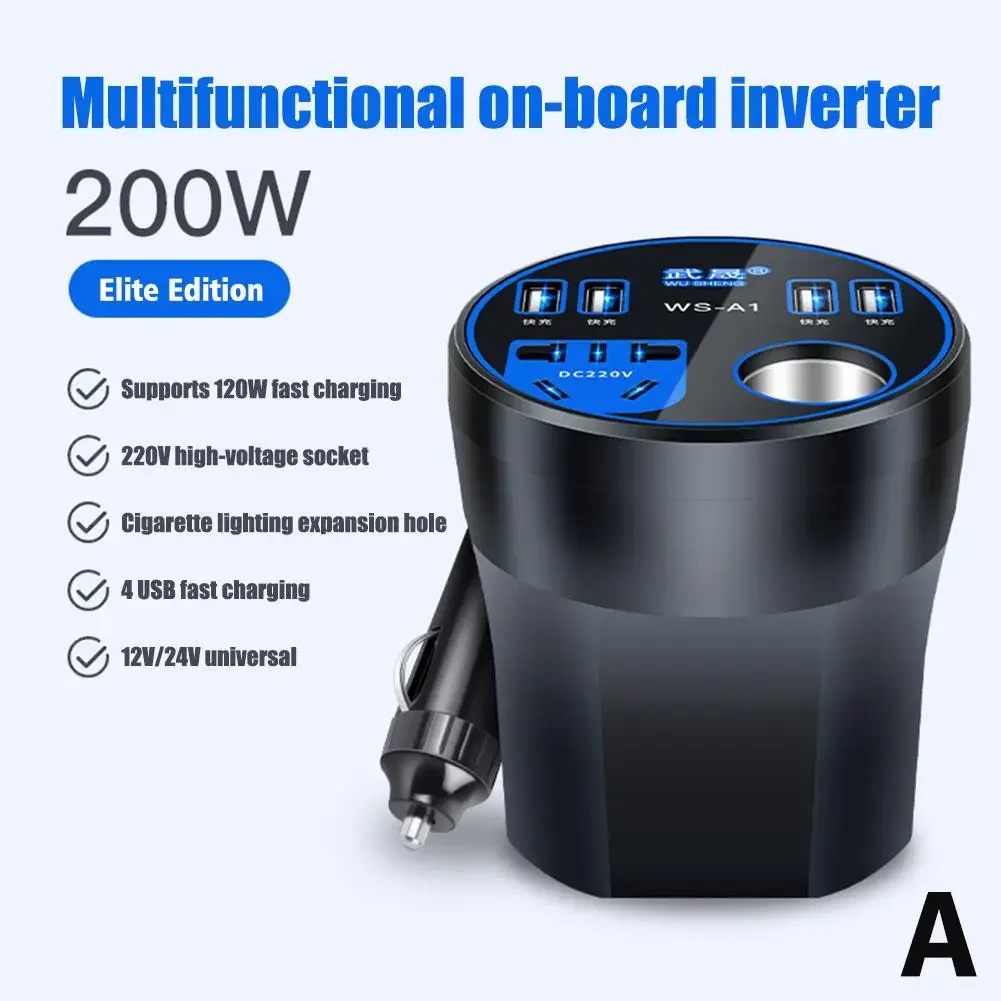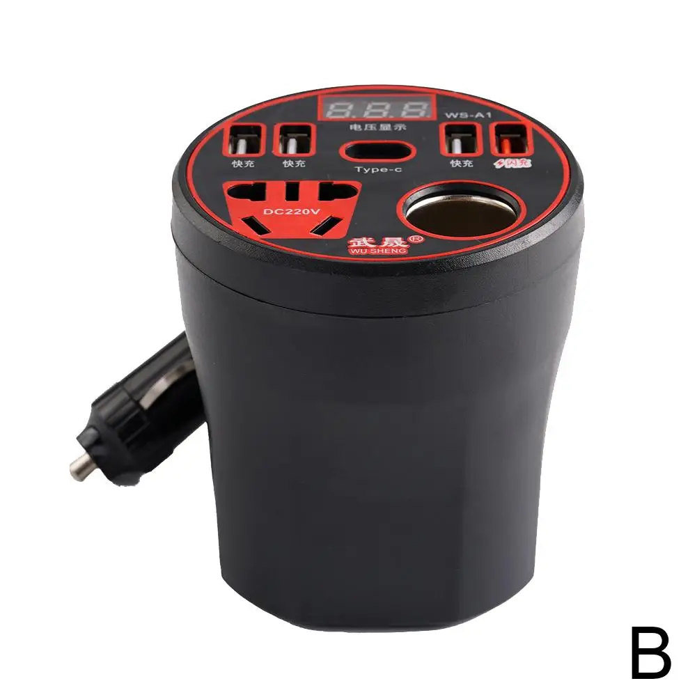 Experience the ultimate convenience with this sleek, modern car power inverter designed for your vehicle’s power needs. Its compact, cylindrical design features a sturdy black matte finish that exudes durability and industrial style, complemented by vibrant blue or red accents. The top surface showcases a well-organized array of ports: four USB quick charge ports with icons indicating rapid power delivery, a Type-C socket for fast charging, and a metallic round socket for standard 220V power. An LED display keeps you updated on voltage levels in real-time, ensuring safe operation. With a 80cm power cable, universal compatibility, and intelligent safety features like automatic shut-off and a durable ABS construction, this inverter transforms your vehicle into a mobile power station, ready to charge all your devices on the go effortlessly.