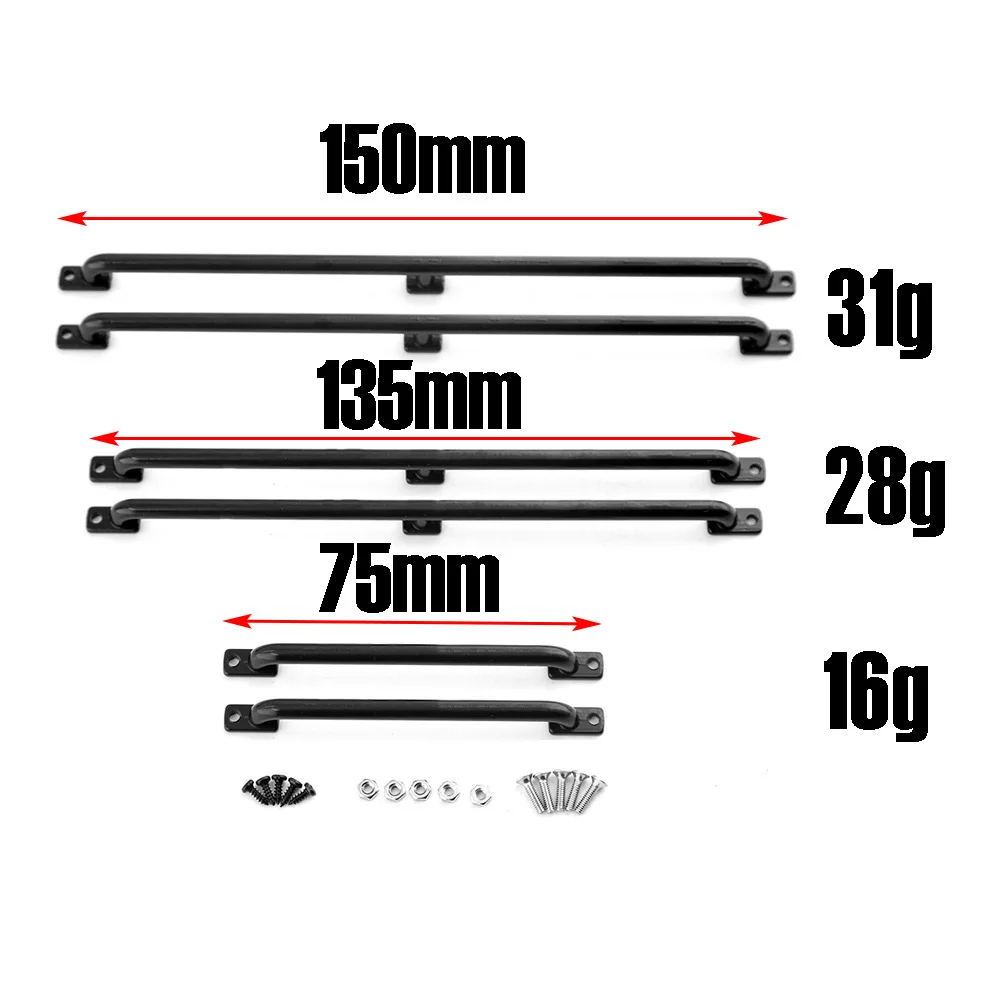 - Set includes 2 handrails with lengths of 75mm, 133mm, or 150mm, crafted from durable, corrosion-resistant metal with a sleek black matte finish.