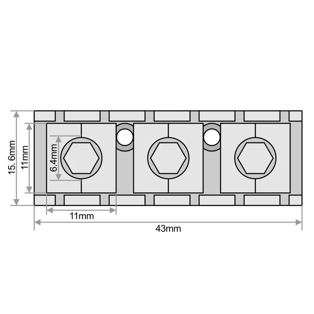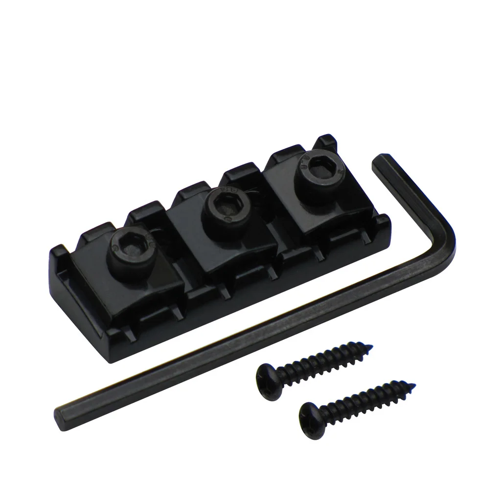 Enhance your electric guitar’s performance with this durable 43mm black metal locking nut, measuring 15.6mm in width, featuring a sleek rectangular design with slightly rounded edges. Its top mount design includes three knurled screws with cross-shaped indentations for precise string locking and adjustment, secured with the included mounting screws and wrench. Crafted from high-quality metal with a matte or semi-gloss finish, this professional-grade component offers a sturdy, reliable solution for maintaining tuning stability. Perfect for custom setups or replacements, this locking nut combines functionality with a minimalist industrial aesthetic, ensuring your guitar stays in tune during even the most demanding playing sessions.