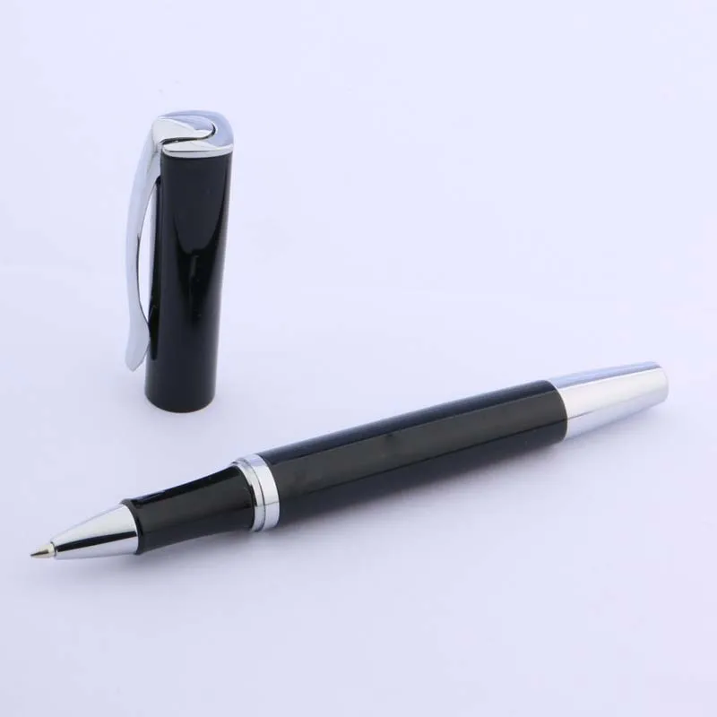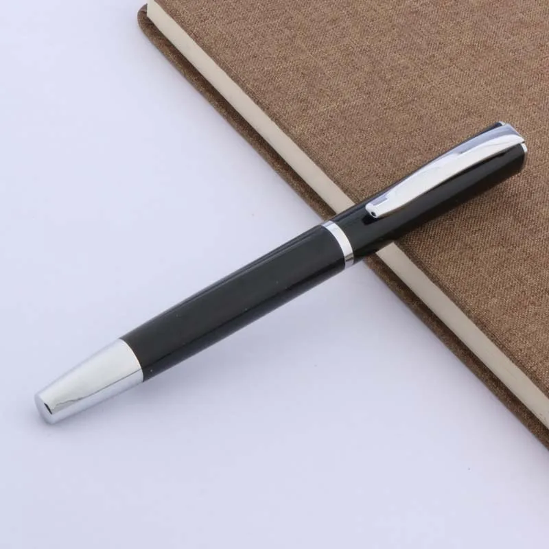 Experience the sleek sophistication of this black metal rollerball pen, perfect for elevating your writing experience. With a smooth, cylindrical body weighing just 35 grams, it offers a lightweight yet durable feel that’s comfortable for everyday use. The glossy black finish, complemented by silver accents, exudes modern elegance. Its pointed 0.5mm tip ensures precise, smooth ink flow, making it ideal for office or school tasks. The pen features a striking minimalist design, suitable for professionals or anyone who appreciates quality stationery. Packaged simply in a protective bag, this pen is a reliable companion for daily writing, letter signing, or gift-giving occasions. Its classic aesthetic blends form with function seamlessly.