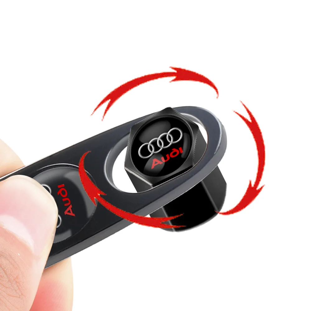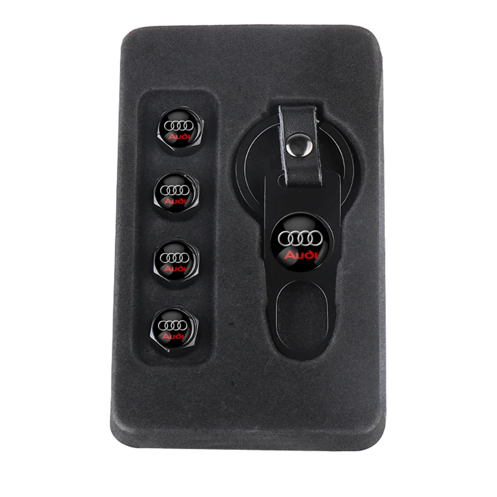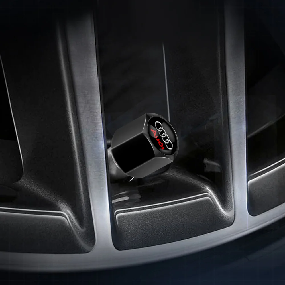 Enhance your vehicle's appearance and protection with this set of four high-quality black metal tire valve caps. Featuring a sleek, cylindrical design with a polished, shiny finish, these caps add a modern, sophisticated touch to your car. Each cap measures approximately 1.2 cm in diameter and 2 cm tall, ensuring a perfect fit for various vehicle models. Adorned with a distinctive silver interlinked rings logo and bold red lettering, they confidently showcase your attention to detail and sense of style. Made from durable metal, these caps effectively prevent dirt, leaks, and damage, while their simple screwing installation makes upkeep quick and effortless. Elevate your vehicle’s look with this premium upgrade that blends style and functionality seamlessly.