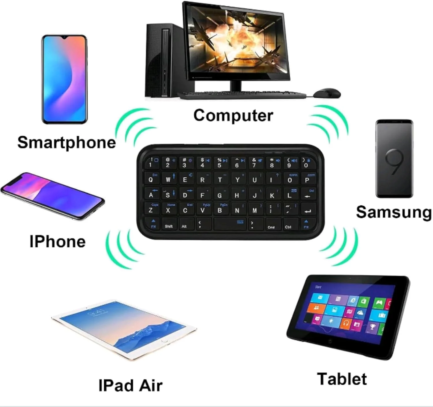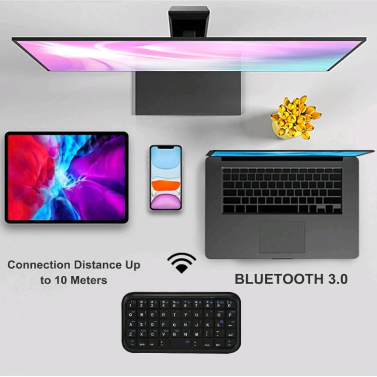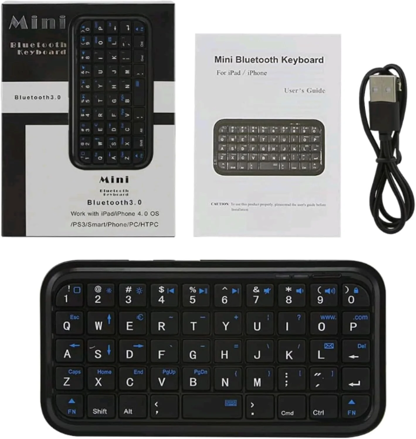 This sleek, compact black Bluetooth 3.0 keyboard measures 114 x 60 x 9mm with a 49-key layout, designed for portability and versatile device compatibility. Equipped with a 1200mAh rechargeable battery, it offers up to 2 hours of charging for extended use within a range of 10 meters (32.8 feet). The capacitive keys with laser-printed white characters provide a smooth typing experience, featuring language options including English, Hebrew, Korean, Russian, and Spanish. Perfect for iOS, Android, Windows Mobile devices, PS3, smartphones, and PCs, this minimalist keyboard combines modern style with reliable performance for your on-the-go needs.