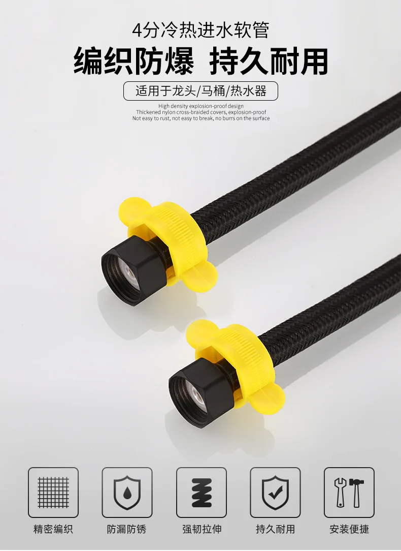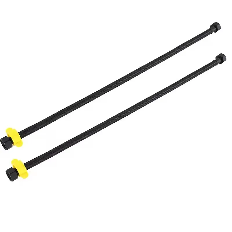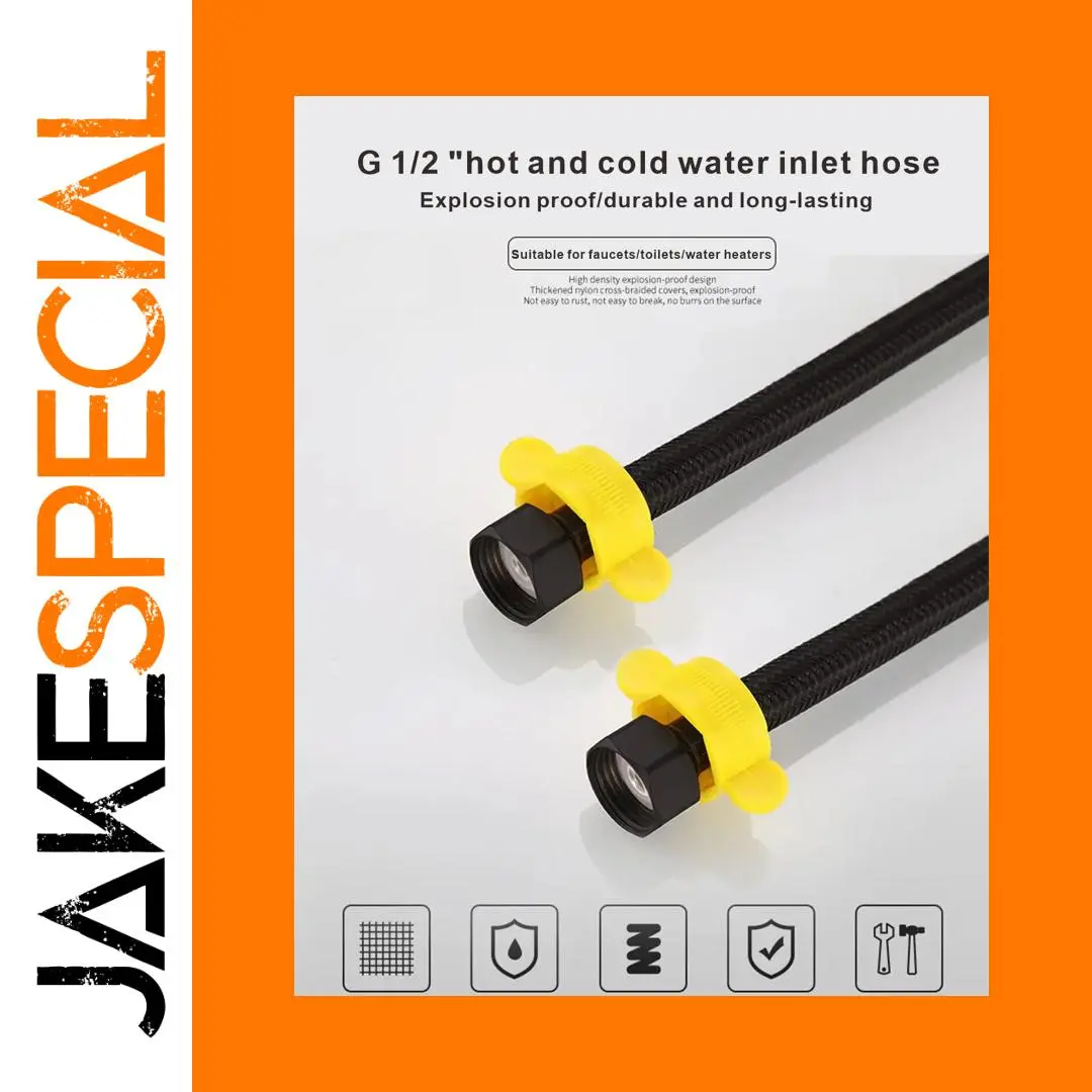 Experience the convenience and reliability of this high-quality black nylon water inlet hose, designed for seamless plumbing connections. Crafted from durable polytene material, it offers excellent flexibility and resistance to wear, ensuring long-lasting performance. The textured, braided surface not only enhances strength but also provides a sleek, modern look that complements any plumbing setup. Fitted with sturdy G1/2″ threaded metal fittings, secured with vibrant yellow protective caps, this hose guarantees a secure, leak-free connection. Available in lengths of 30cm, 40cm, 60cm, or 80cm, you can choose the perfect size to suit your installation needs. Whether you're replacing an old hose or installing a new system, this product delivers dependable water flow for your water heater, toilet, kitchen, or bathroom.
