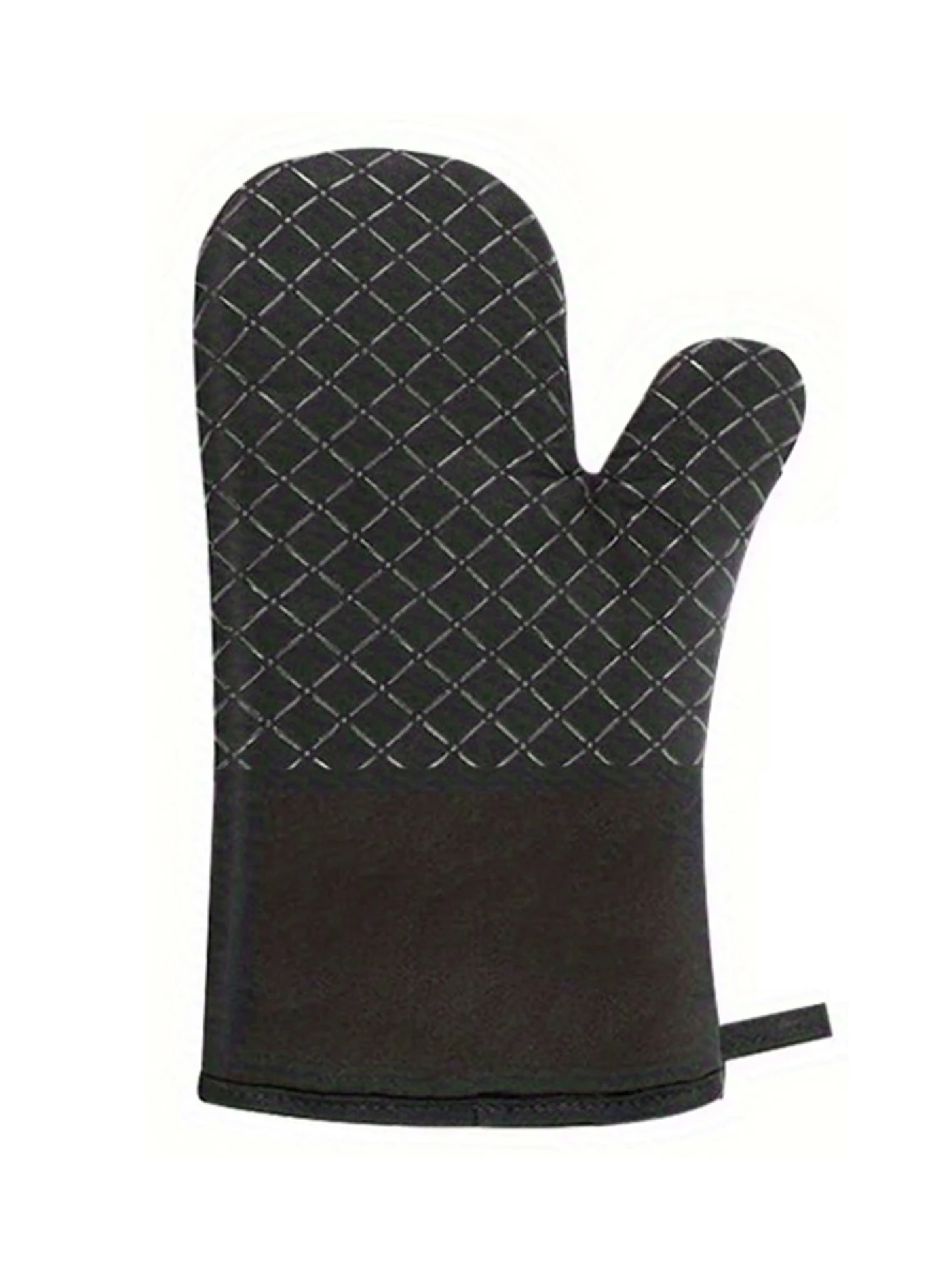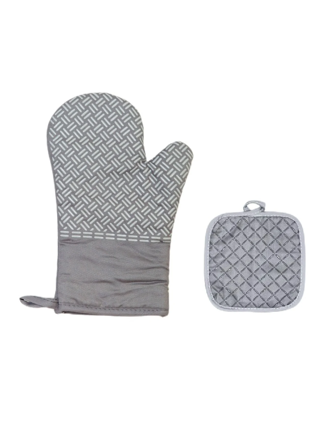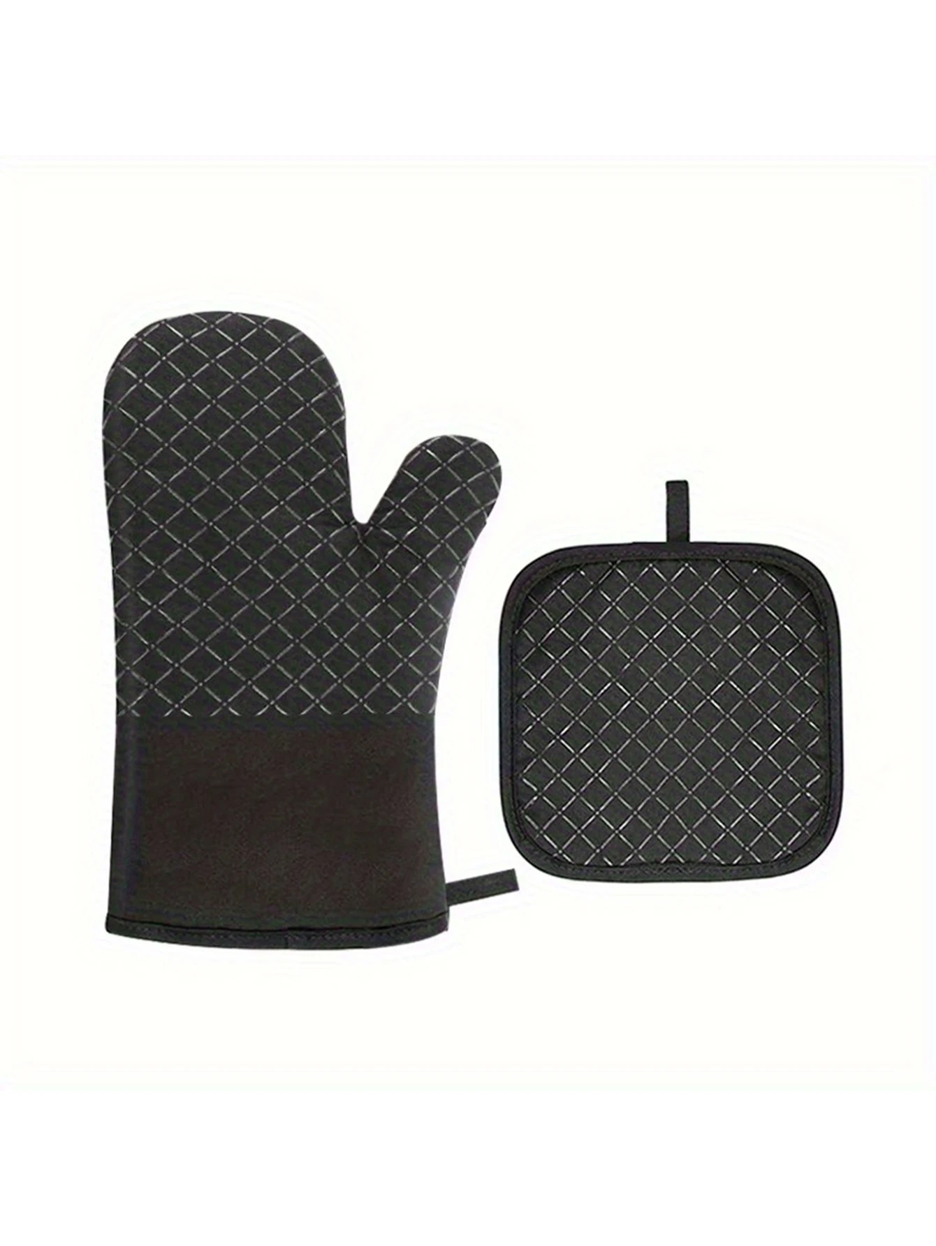 Experience superior heat protection with this stylish pair of oven mitts and pot holders, crafted from durable cotton and polyester with silicone weaving for enhanced grip and insulation. Designed for anti-scald safety during baking and cooking, these items feature a sleek black color with contrasting diamond-patterned quilting and light-colored stitching that adds a refined touch. The elongated, slightly curved gloves comfortably fit the hand, while the square-shaped pot holders with rounded edges provide practical functionality. Available in black, gray, and red, they combine modern design with reliable performance, making your culinary tasks safer and more enjoyable.