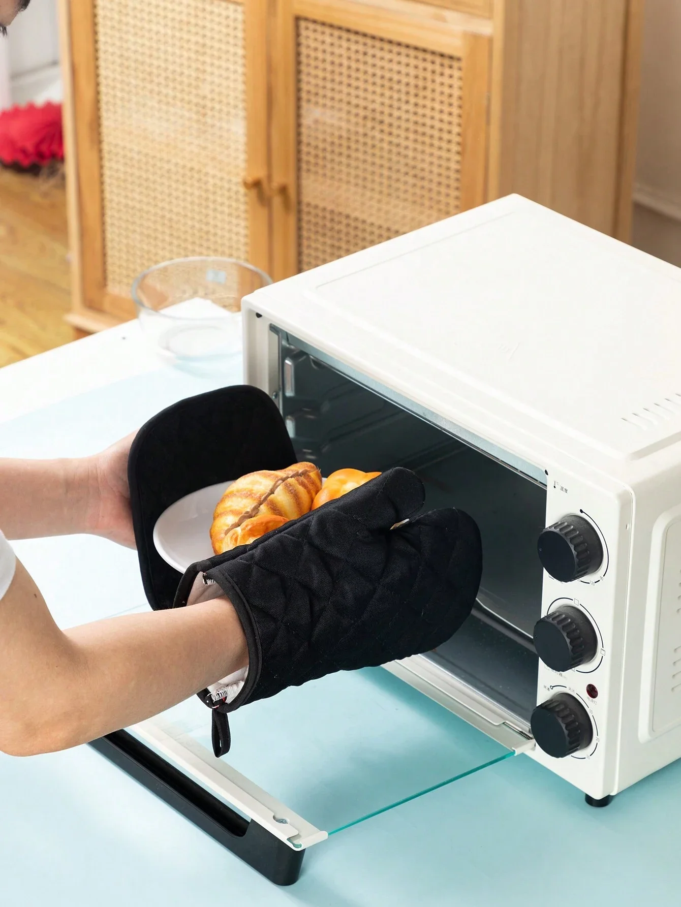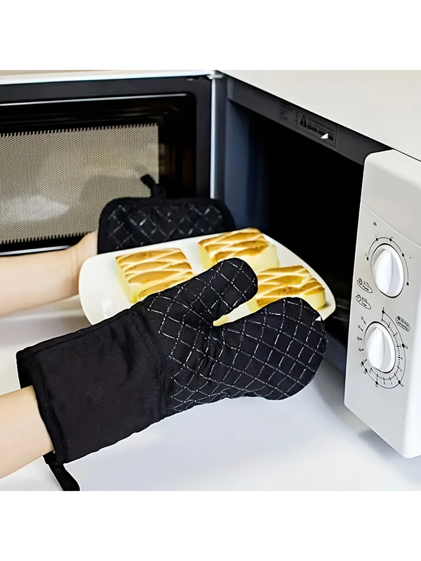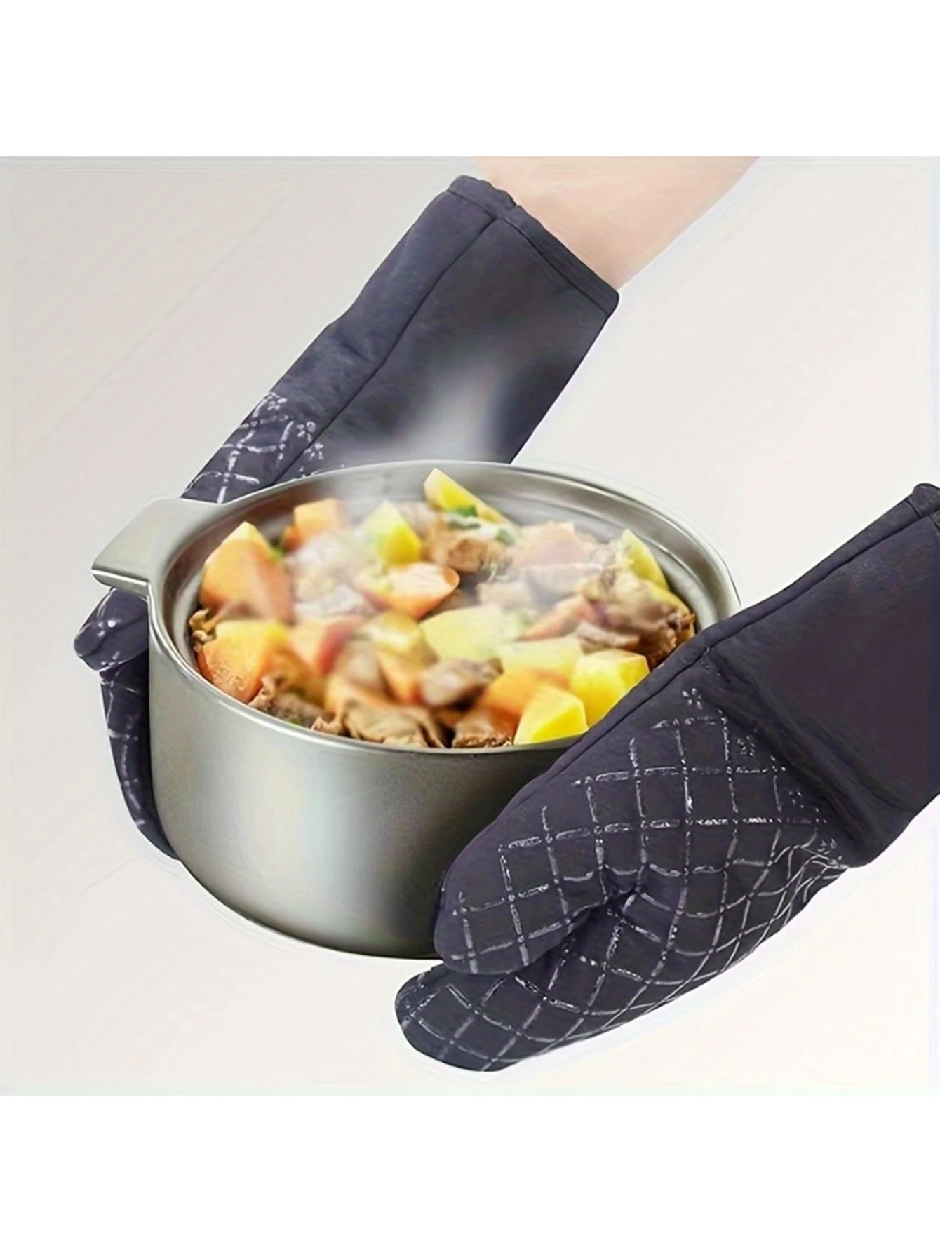 Experience superior heat protection with this stylish pair of oven mitts and pot holders, crafted from durable cotton and polyester with silicone weaving for enhanced grip and insulation. Designed for anti-scald safety during baking and cooking, these items feature a sleek black color with contrasting diamond-patterned quilting and light-colored stitching that adds a refined touch. The elongated, slightly curved gloves comfortably fit the hand, while the square-shaped pot holders with rounded edges provide practical functionality. Available in black, gray, and red, they combine modern design with reliable performance, making your culinary tasks safer and more enjoyable.