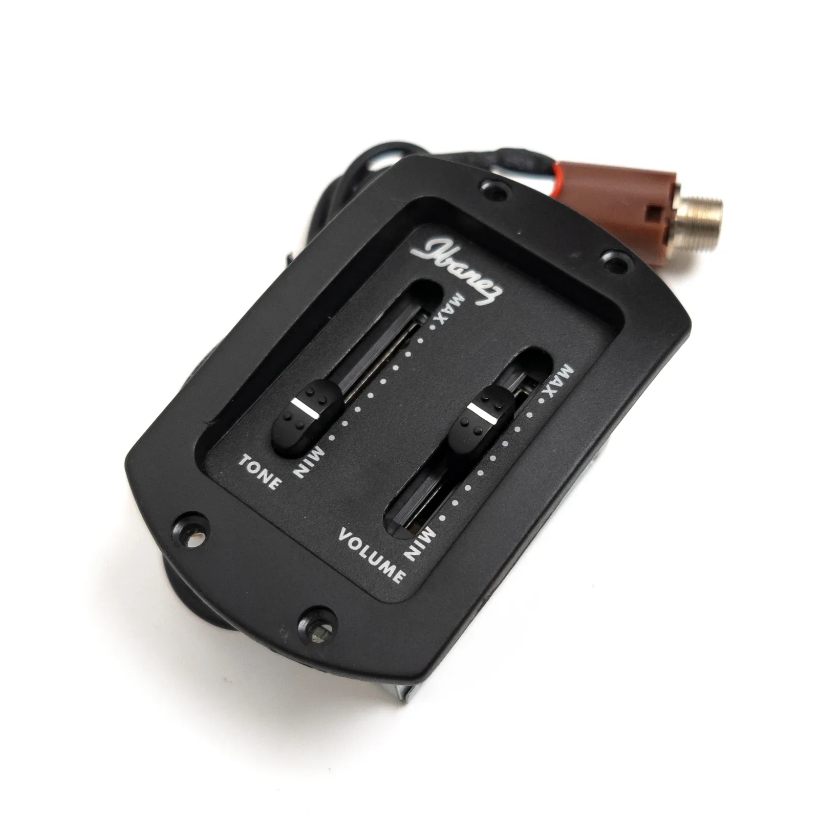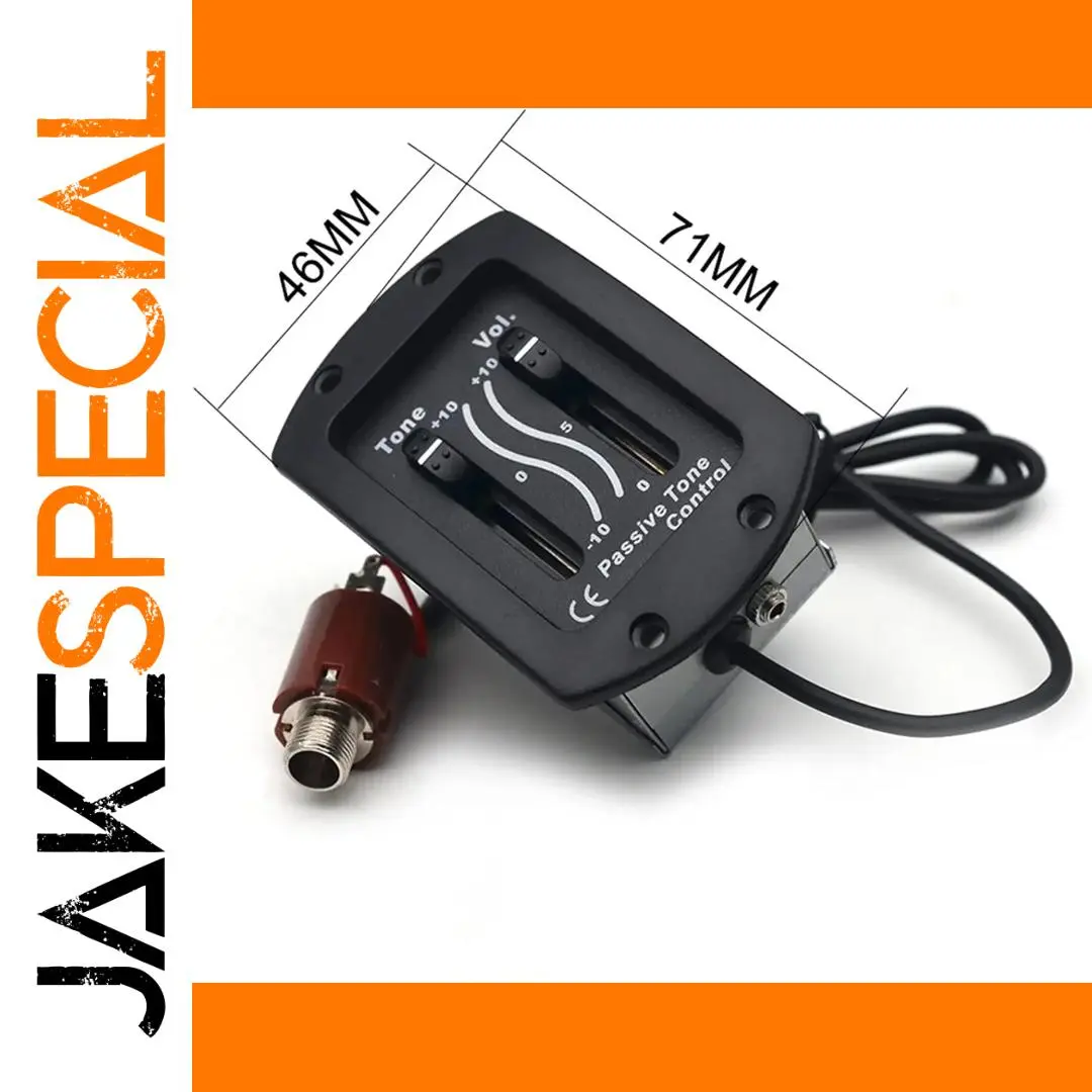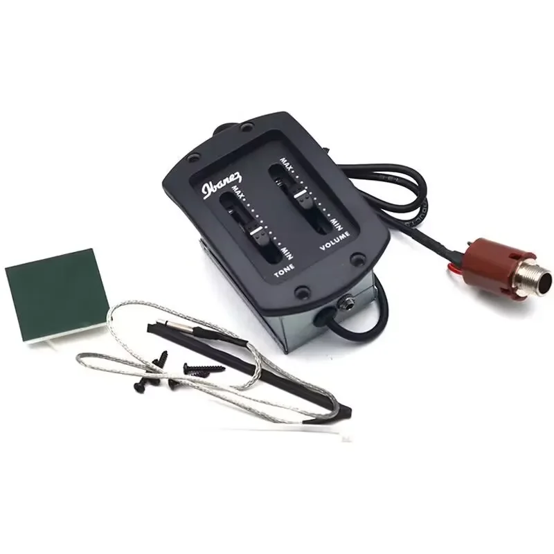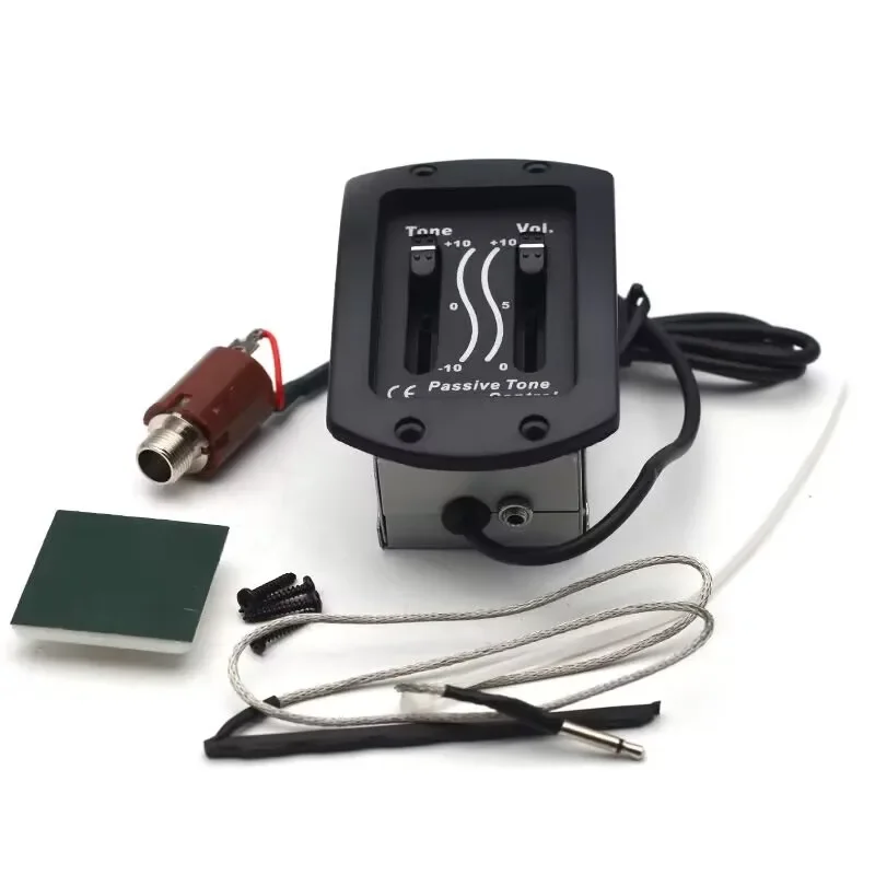 Transform your acoustic guitar with this sleek, black passive EQ pickup, offering exceptional sound clarity without the need for batteries. Its compact size of 71mm by 46mm makes installation effortless on most acoustic guitars, providing a seamless fit that doesn’t interfere with your playing. Crafted with durable composite materials, this pickup ensures reliability and longevity whether you're performing live or recording at home. The minimalist design features a smooth black finish and a small red connector on the side, adding a subtle pop of color. With independent volume and tone sliders, you can quickly adjust your guitar’s sound to match your style, capturing the natural resonance and warmth of your instrument with enhanced detail. This system elevates your performance by delivering authentic sound reproduction in any setting.