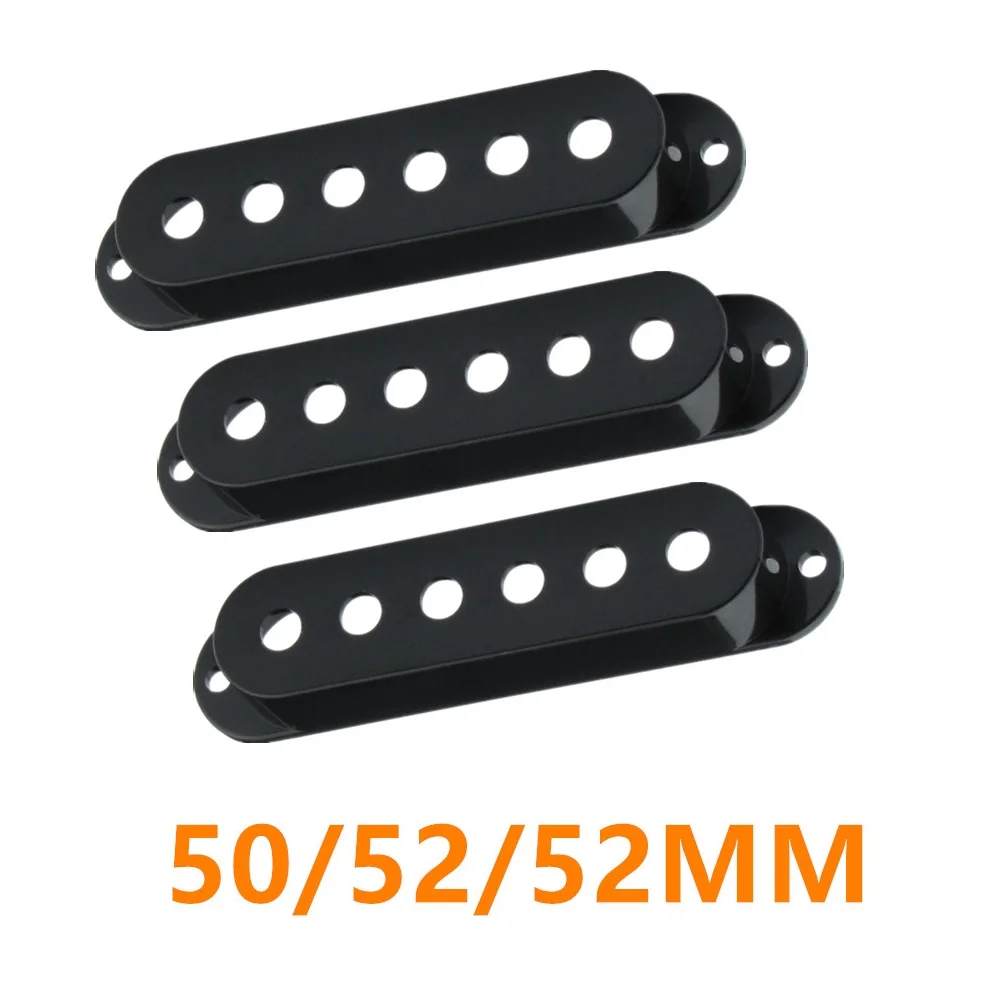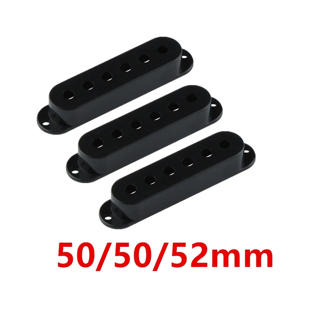 Enhance your electric guitar’s appearance with this set of three black plastic pickup covers, designed specifically for Stratocaster-style instruments. Each cover is elongated with a smooth matte or semi-matte finish, enhancing durability and aesthetic appeal. The rounded edges create a streamlined look, while the precisely aligned six circular holes across the center add a subtle geometric detail. Perfectly compatible with single-coil pickups, these covers fit pole spacings of either 50/50/52mm or 50/52/52mm, depending on your model. Please note, mounting screws and springs are not included, allowing you to customize mounting hardware. These covers not only protect your pickups but also give your guitar a sleek, professional appearance.