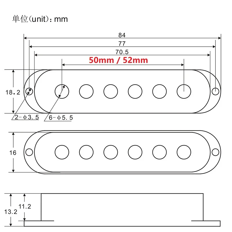- Dimensions vary with pole spacing of approximately 50mm or 52mm, ensuring proper fit and compatibility across different Strat models and pickup configurations.
