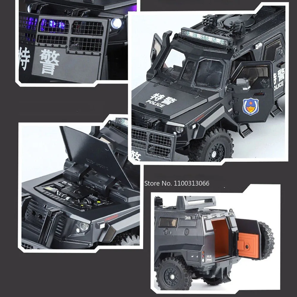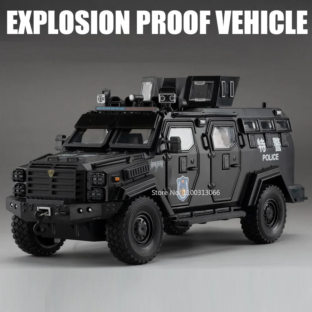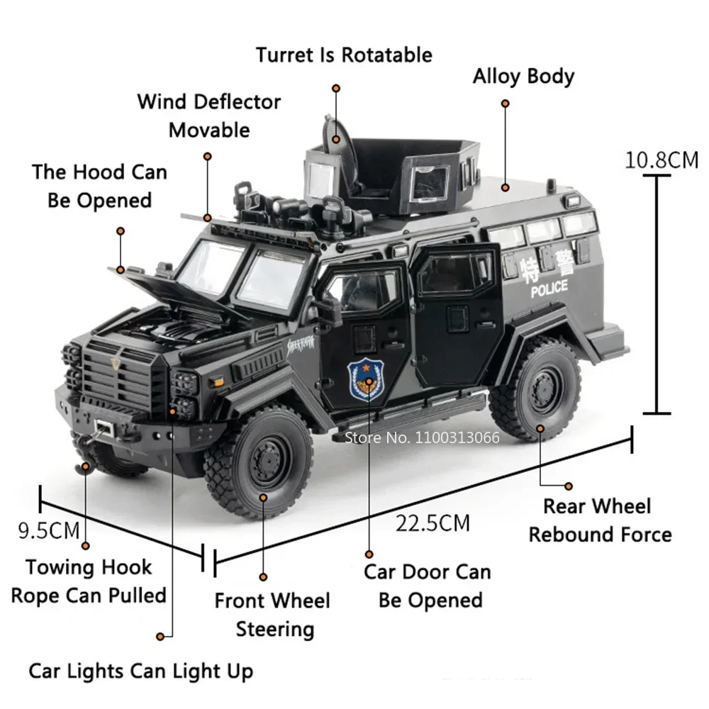 - Approximately 24.5 x 10 x 11.5 cm size, with detailed textured armor panels, rugged appearance, and realistic design inspired by tactical police vehicles.