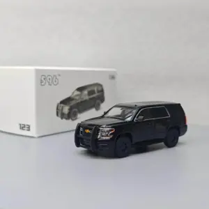 This realistic diecast model of a police SUV in 1:64 scale features a sleek black plainclothes patrol design, representing either a Tahoe or Suburban. Crafted from durable metal alloy, it showcases detailed front grille with molded headlights, subtle door panel lines, and transparent plastic windows revealing a proportionate interior. The vehicle rides on black wheels with intricately detailed hubcaps, complementing its monochromatic aesthetic. Suitable for collectors aged 14 and above, this non-electric, chemical-free model embodies a sturdy, authentic appearance perfect for display or display-based collections. Its simple, no-frills style makes it an ideal addition to any law enforcement-themed miniature collection.