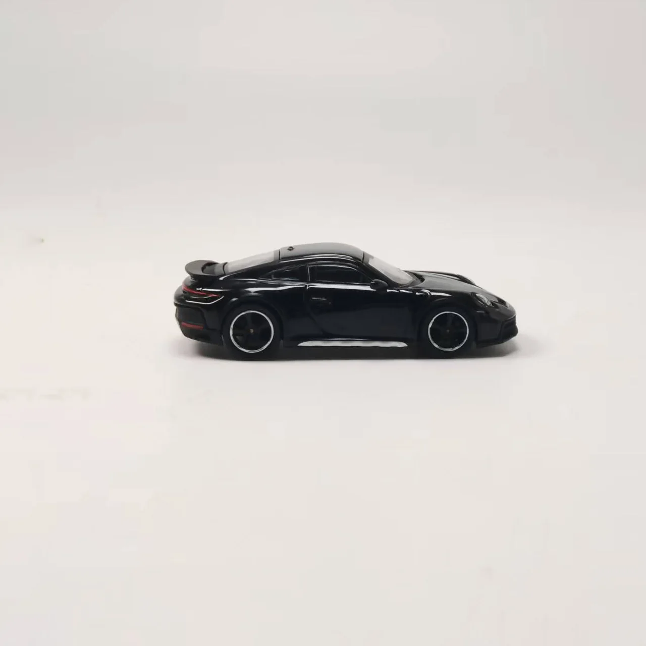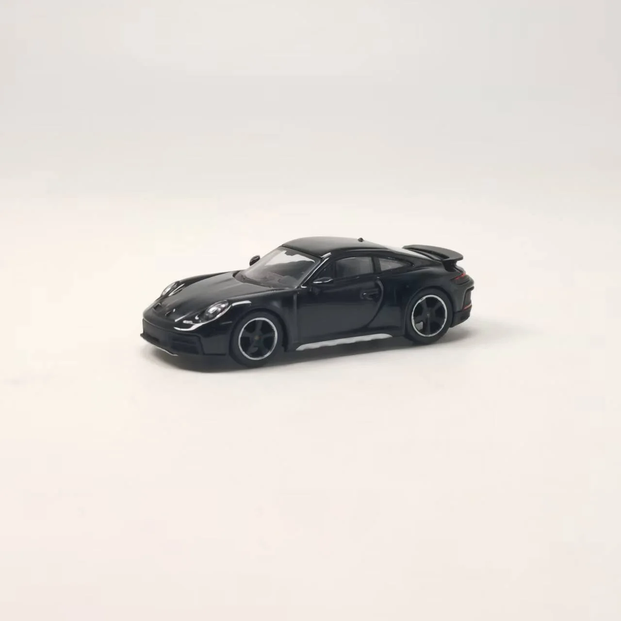 This highly detailed die-cast model of a Porsche 911, scaled at 1:64, is crafted from alloy, rubber, and plastic for an authentic metallic appearance. It features a glossy black finish, transparent plastic windows, detailed headlights with clear lenses, and red tail lights. The black wheels with silver accents mimic real tires with textured treads, showcasing realistic craftsmanship. Designed for collectors and enthusiasts, this static display captures the sporty elegance of the original vehicle, making it an ideal souvenir, decorative piece, or gift. Measuring approximately 1/64th of the actual car size, it is suitable for ages 14 and above and ships in a visually appealing color box.