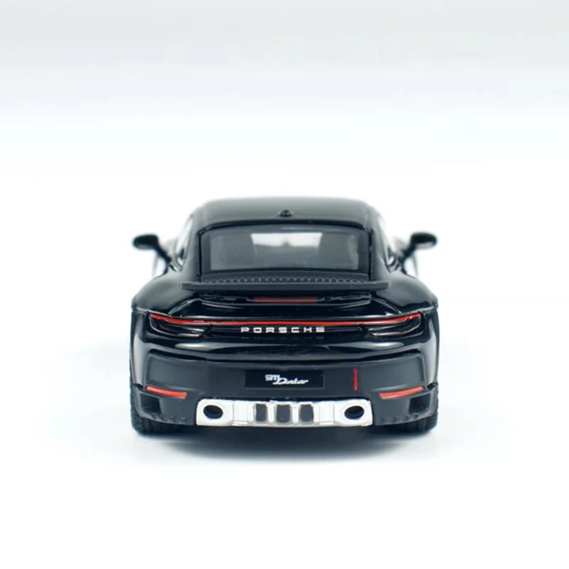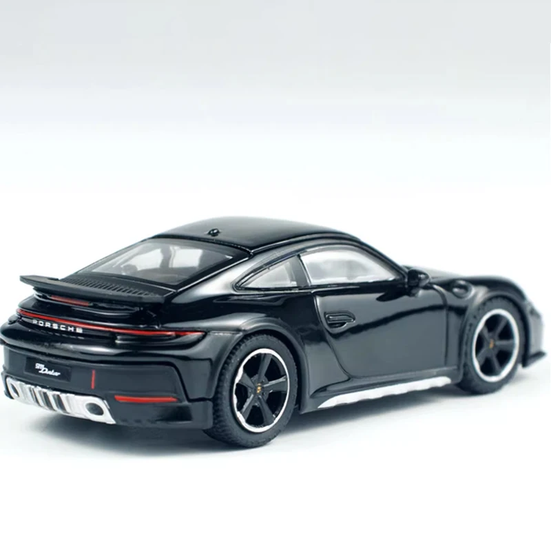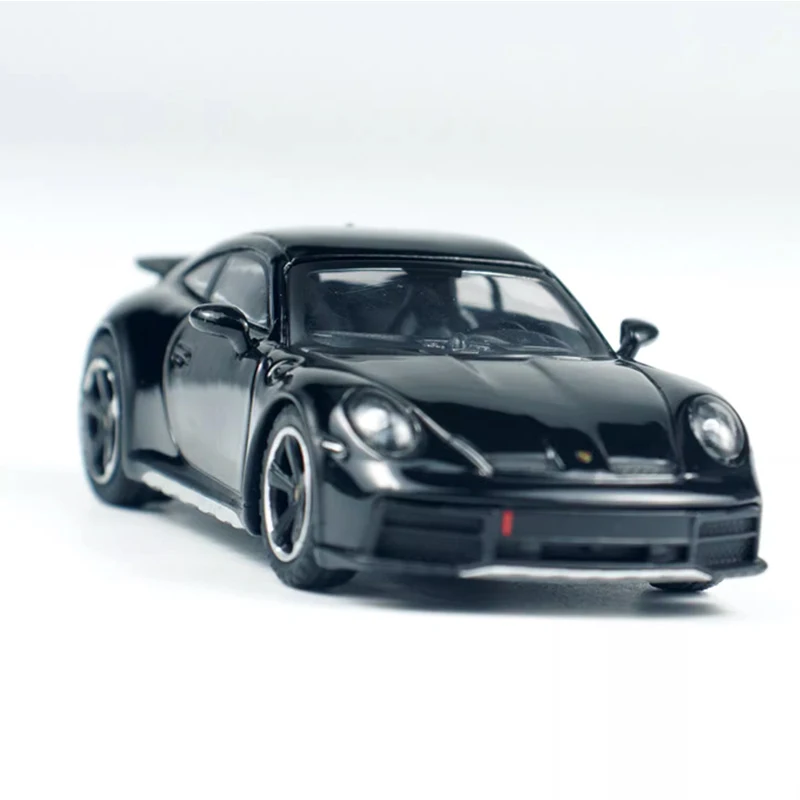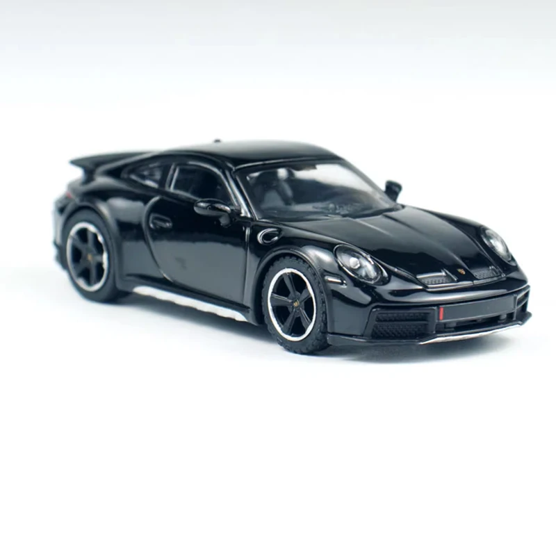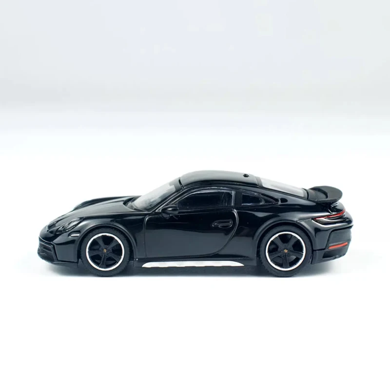 Experience the allure of this high-quality diecast alloy Porsche 911 Dakar, meticulously crafted for enthusiasts and collectors alike. Its sleek black finish brings out the smooth, aerodynamic lines, highlighting the sporty, low-profile design. The model features detailed front air intakes, oval headlights, and a raised rear spoiler that accentuate its dynamic appeal. Transparent side windows reveal a finely detailed interior, while precision-cut silver rims and textured tires add realism. Panel lines, vents, and subtle design accents reflect careful craftsmanship, making this piece an elegant display item. Whether you’re decorating your space or expanding your collection, this model offers a perfect blend of sophistication and technical detail, guaranteed to impress.