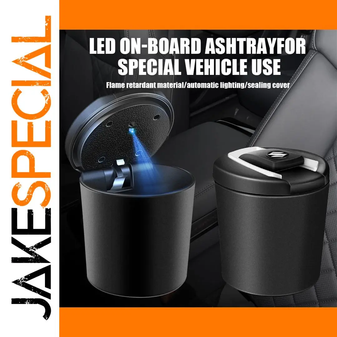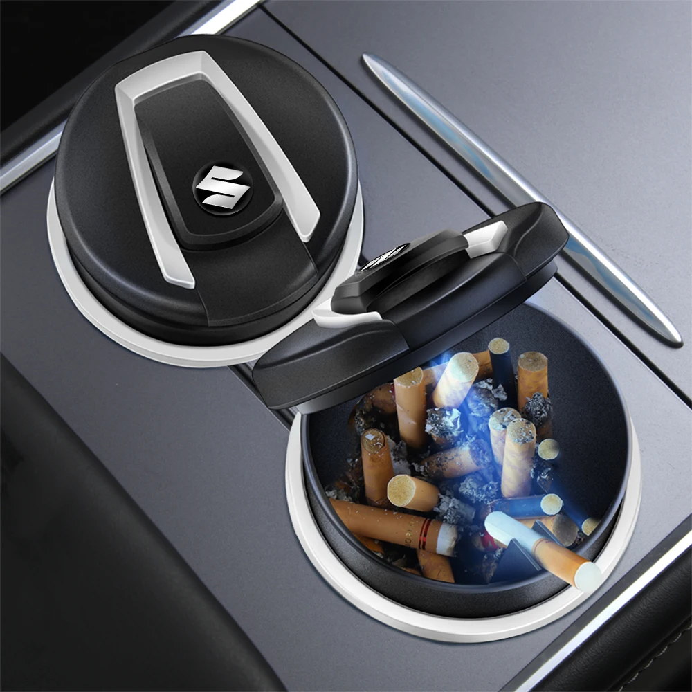 Experience convenience and style with this this black portable car ashtray, specially designed for Suzuki models like Swift, Jimny, Vitara, and Alto. Crafted from durable ABS plastic and metal, it features a modern cylindrical shape with a matte black finish, blending seamlessly into your vehicle's interior. Its double-layer sealed design ensures flame retardance and odor containment, providing a safe and discreet way to dispose of cigarette ash. The ashtray automatically pops up with a simple finger touch, allowing for easy, hands-free operation that won’t distract you while driving. An elegant soft blue LED light illuminates the opening at night, combining practicality with a high-tech aesthetic. Compact, stylish, and functional, this ashtray is an excellent accessory for maintaining a clean vehicle environment, whether on the road or at home or office.