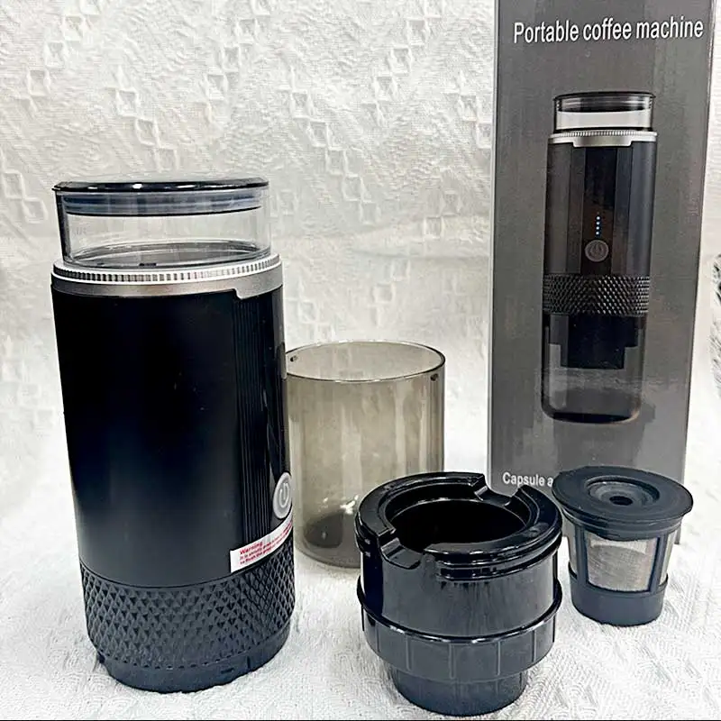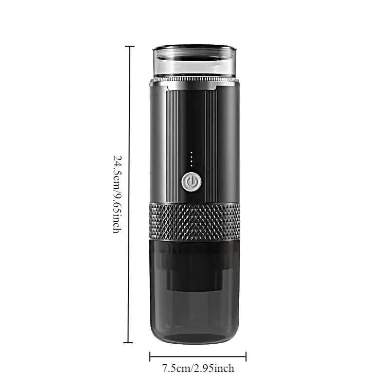 Experience the convenience of this sleek, black portable coffee maker, designed for on-the-go brewing with versatility and style. Compatible with both ground coffee and capsules, it is powered by a rechargeable battery system, ensuring you can enjoy fresh coffee anytime, anywhere. Its compact, ergonomic design features a textured grip and a transparent lid, allowing easy handling and visual monitoring during brewing. Small blue LED indicators subtly highlight its operational status, while the modern cylindrical shape exudes minimalist elegance. Perfect for travel enthusiasts, this handheld device combines functionality with a refined aesthetic, making every coffee moment effortless and enjoyable wherever your adventures take you.