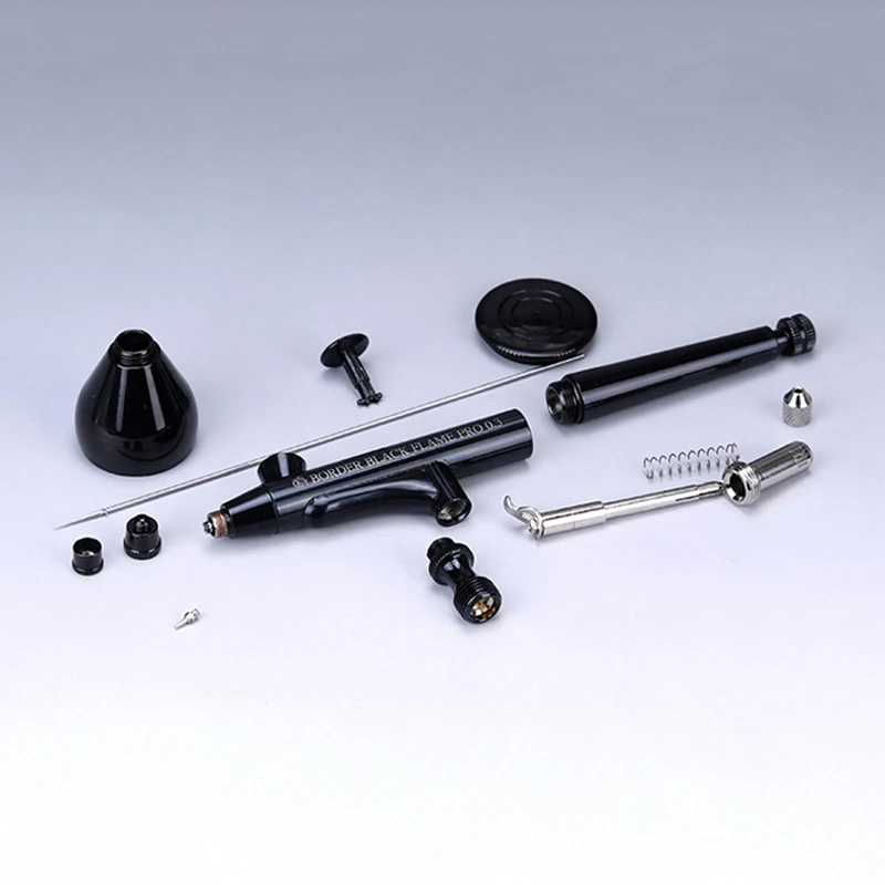 Imagine elevating your artistry with this professional-grade, sleek black airbrush spray pen. Its polished metallic accents and minimalist design provide a refined aesthetic, perfect for detailed model painting, miniatures, or sci-fi figures. The large conical paint cup offers effortless filling, while the finely threaded, precision nozzle ensures accurate spray output. Designed for precision, it features a dual-jet setup and a universal adapter for versatile compatibility with various air pumps. The multilayered plated interior of the paint pot guarantees smooth operation, enabling seamless, even atomization of paints. Whether you are an experienced creator or a passionate beginner, this tool empowers you to bring your detailed visions to life with high accuracy and flawless finish. Its sturdy construction and elegant appearance make it an essential addition to your artistic toolkit.